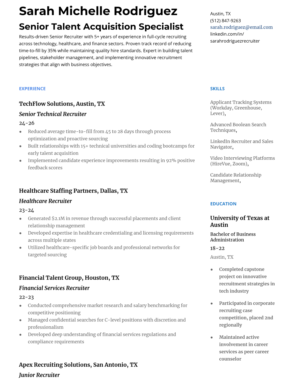 A Senior Recruiter leads talent acquisition strategies, manages complex hiring processes, and builds relationships with candidates and hiring managers across multiple departments. They specialize in sourcing top-tier talent, conducting behavioral interviews, negotiating offers, and developing recruitment pipelines for hard-to-fill positions. Senior Recruiters often mentor junior team members and collaborate with leadership on workforce planning and employer branding initiatives. An ATS-friendly resume is crucial for Senior Recruiters because HR departments heavily rely on applicant tracking systems to screen for specific recruiting tools, sourcing techniques, and industry experience. Recruiters reviewing these resumes look for keywords like Boolean search, LinkedIn Recruiter, candidate pipeline management, and metrics around time-to-fill and quality of hire.
