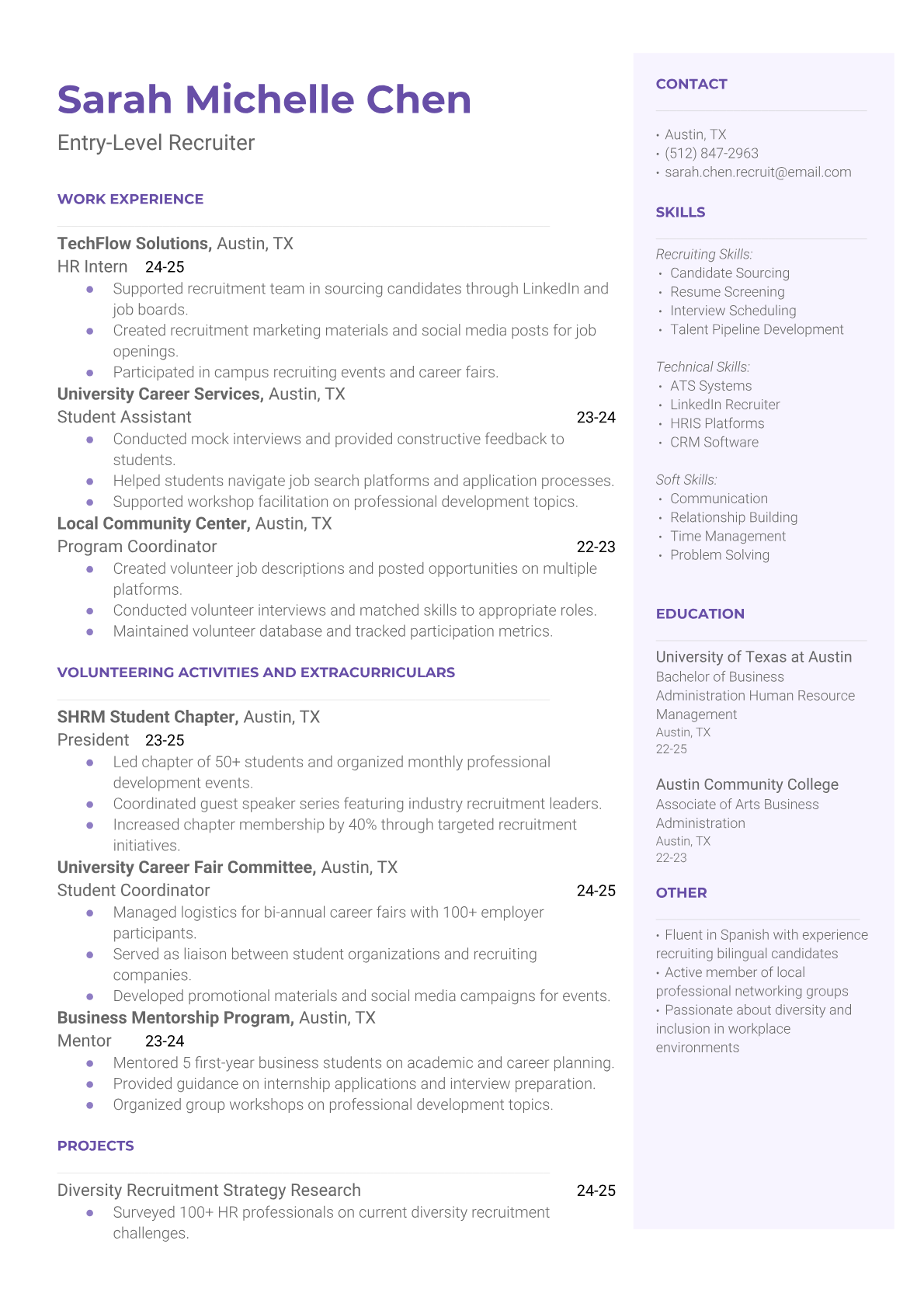 An Entry-Level Recruiter sources, screens, and interviews candidates for open positions across various departments and industries. They work with hiring managers to understand job requirements, post job listings, review resumes, conduct initial phone screenings, and coordinate interviews. The role involves building talent pipelines, maintaining candidate databases, and supporting the full recruitment lifecycle from job posting to offer negotiation. ATS-friendly resumes are crucial for entry-level recruiters because HR departments heavily rely on applicant tracking systems to filter candidates based on recruiting software experience, sourcing tools, and HR certifications. Without proper keyword optimization highlighting skills like Boolean searching, candidate screening, and HRIS systems, qualified recruiting candidates may be automatically filtered out before reaching hiring managers.