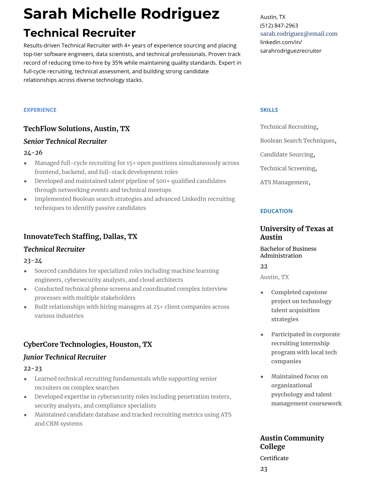 A Technical Recruiter specializes in sourcing, screening, and hiring candidates for technology roles across software engineering, data science, cybersecurity, and IT infrastructure. They partner with hiring managers to understand technical requirements, conduct initial screenings, and manage the recruitment pipeline from job posting to offer negotiation. The role requires both recruiting expertise and technical knowledge to effectively evaluate candidates' skills and cultural fit. An ATS-friendly resume is crucial for Technical Recruiters because most staffing agencies and tech companies use sophisticated applicant tracking systems to filter candidates. Recruiters need resumes that clearly highlight their sourcing tools, technical recruiting metrics, and industry expertise to pass initial screenings and demonstrate their value to hiring managers.