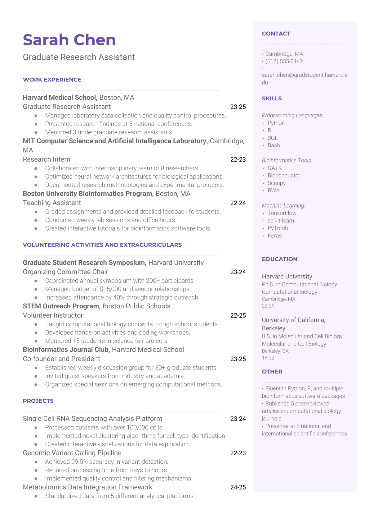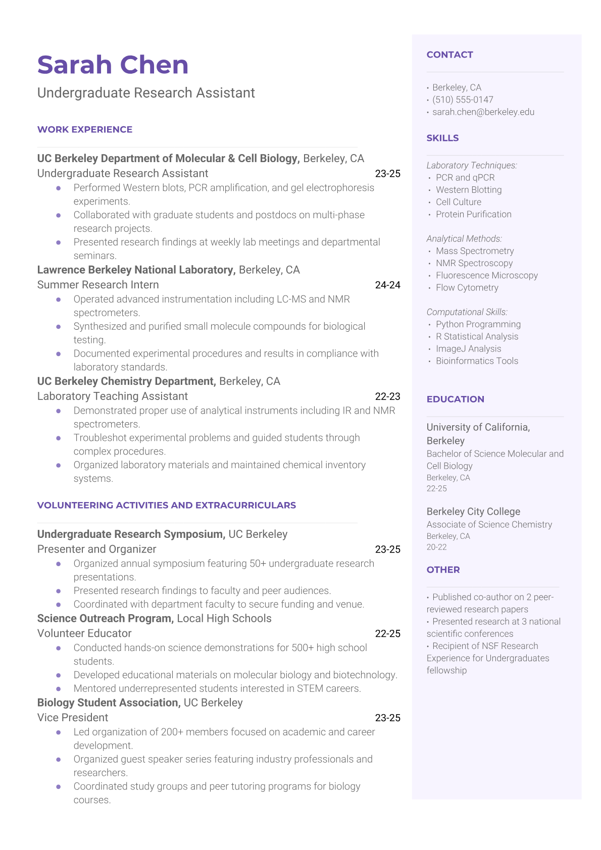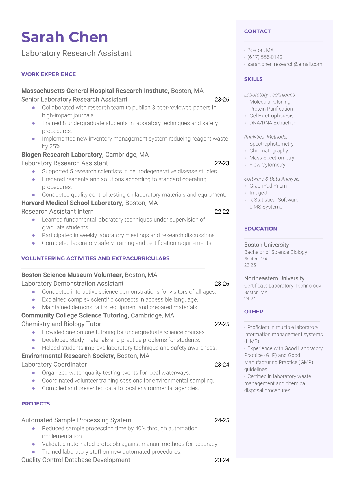 A Laboratory Research Assistant conducts experiments, collects data, and maintains laboratory equipment to support scientific research projects. They work under the supervision of senior researchers, preparing samples, running tests, recording observations, and ensuring compliance with safety protocols. The role requires attention to detail, technical skills with laboratory instruments, and the ability to follow complex procedures accurately. An ATS-friendly resume is crucial for laboratory positions because research institutions and biotech companies use automated systems to screen for specific technical skills, laboratory techniques, and safety certifications. Without proper keywords like PCR, HPLC, GLP compliance, or specific instrumentation experience clearly formatted, qualified candidates may be filtered out before human reviewers see their applications.