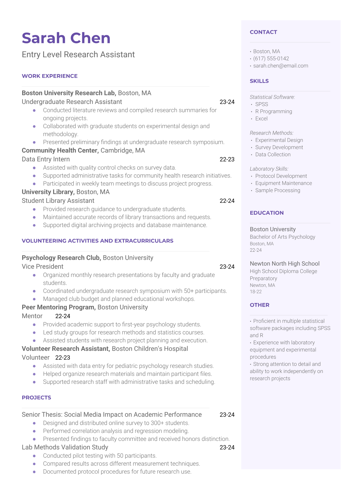 An Entry Level Research Assistant supports academic faculty, research teams, or institutions by conducting literature reviews, collecting and analyzing data, managing research databases, and assisting with experimental procedures. They work in universities, think tanks, government agencies, or private research organizations, often serving as the foundation for larger research projects while gaining valuable experience in research methodologies and academic processes. An ATS-friendly resume is crucial for research assistant positions because academic institutions and research organizations increasingly use automated systems to screen applications for specific research skills, software proficiency, and academic qualifications. Without proper keyword optimization for research methods, statistical software, and relevant coursework, qualified candidates may be filtered out before human reviewers can assess their potential.