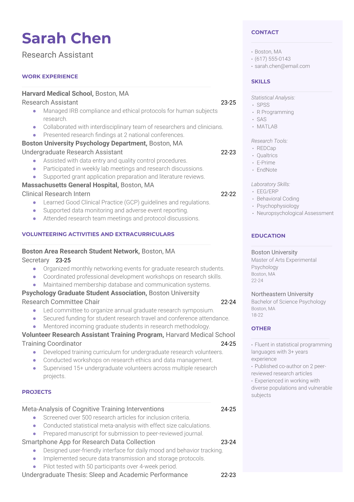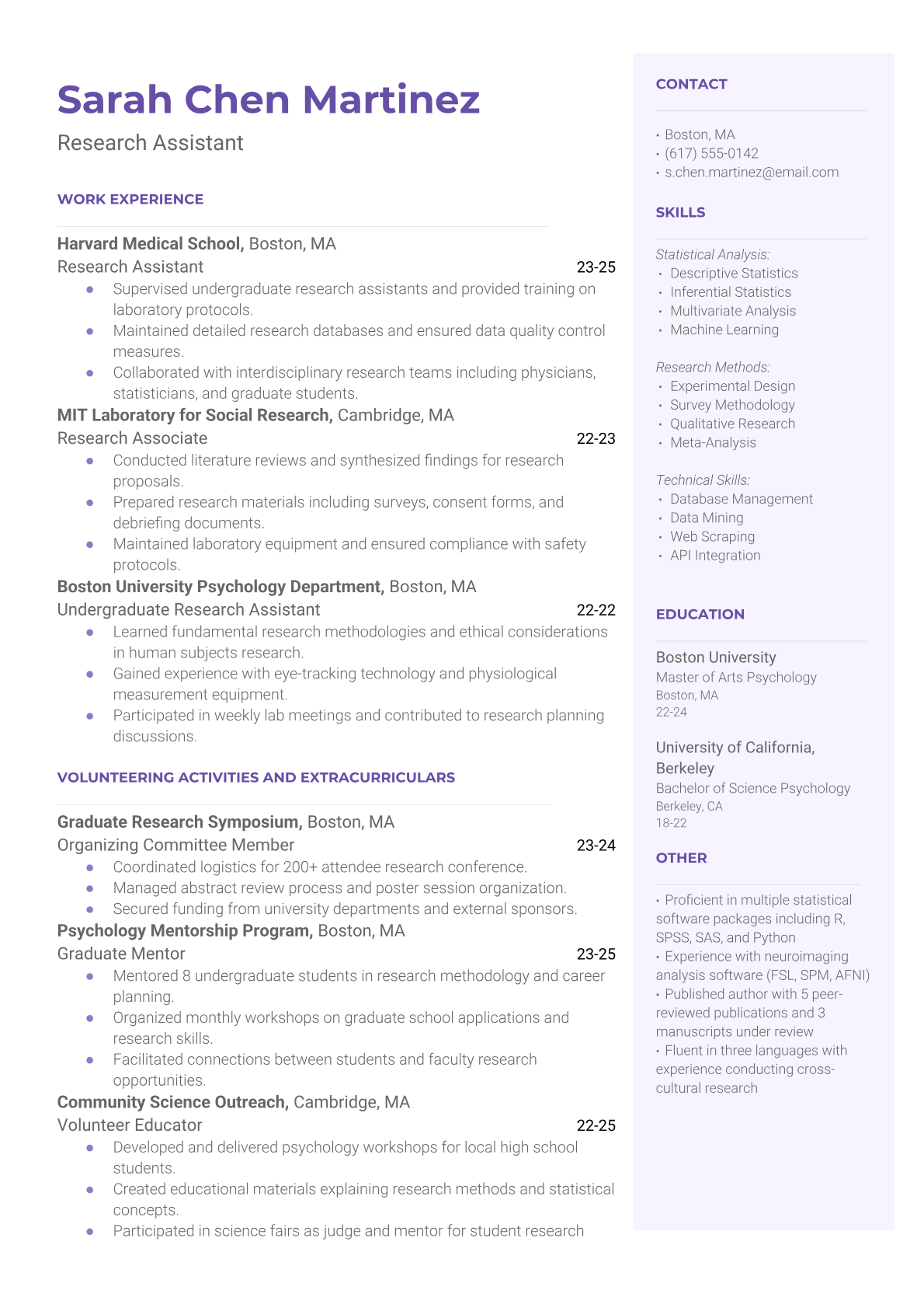 A Psychology Research Assistant supports academic and clinical research by collecting data, conducting literature reviews, administering psychological assessments, and assisting with statistical analysis. They work in university labs, hospitals, or research institutions to help advance understanding of human behavior, mental health treatments, and psychological theories. The role requires strong analytical skills, attention to detail, and knowledge of research methodologies and ethical guidelines. An ATS-friendly resume is crucial for Psychology Research Assistant positions because academic institutions and research facilities use automated systems to screen for specific qualifications like statistical software proficiency, research experience, and relevant coursework. Without proper keyword optimization for terms like SPSS, IRB protocols, data collection, and psychological assessment tools, qualified candidates may be filtered out before human reviewers can evaluate their research potential.