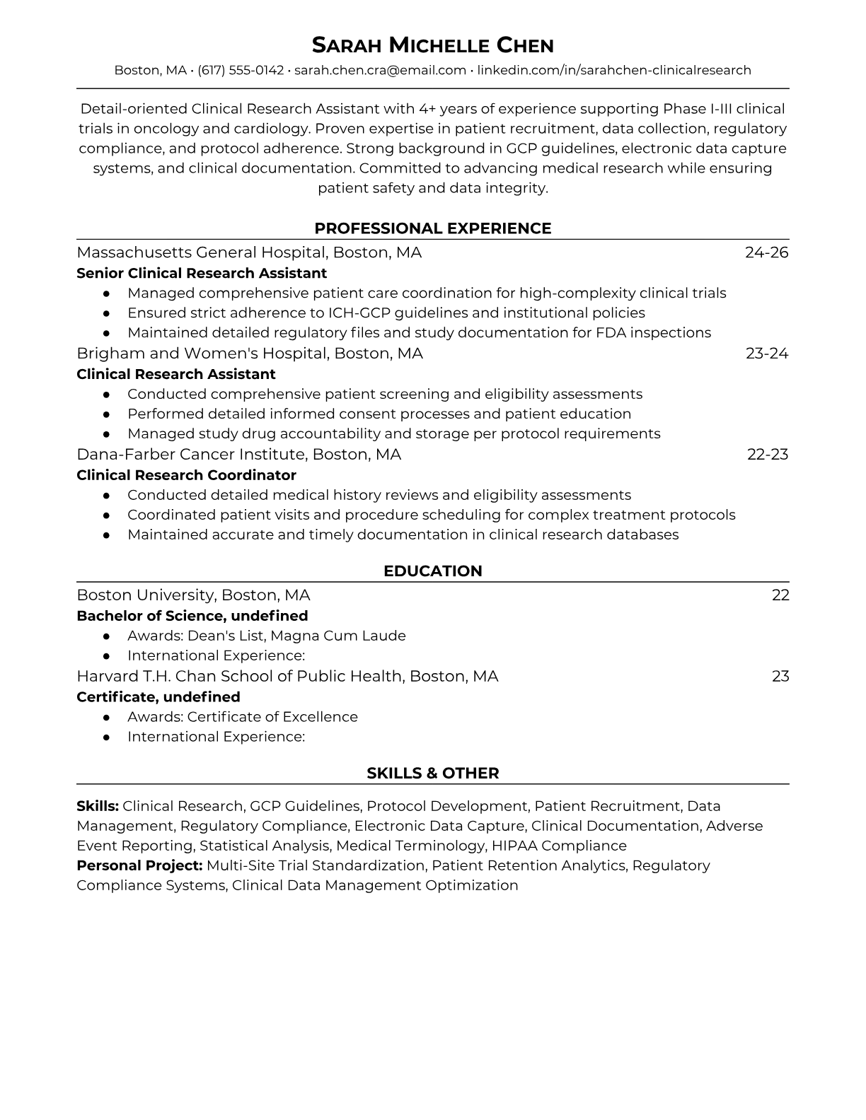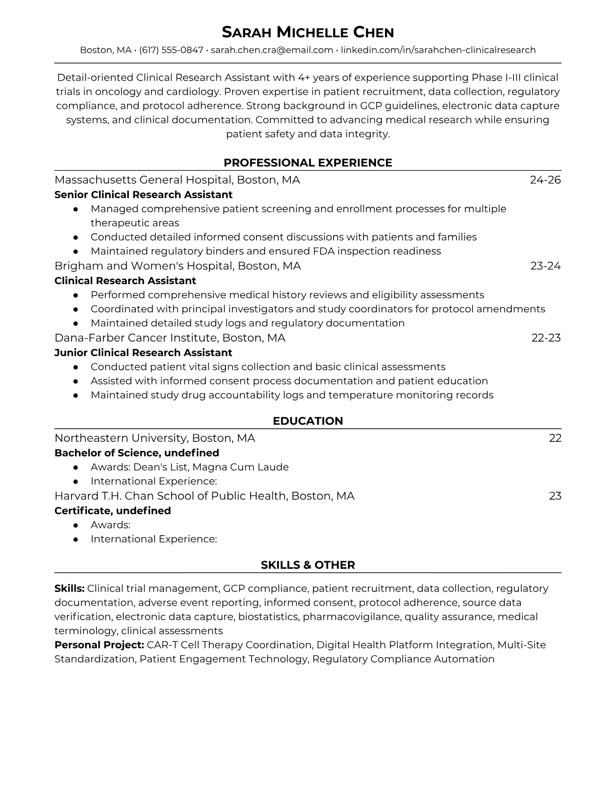 A Clinical Research Assistant supports the planning, execution, and monitoring of clinical trials and medical research studies. They collect and manage patient data, ensure regulatory compliance, coordinate with research teams, and maintain detailed documentation throughout the research process. The role requires strong attention to detail, knowledge of Good Clinical Practice (GCP) guidelines, and the ability to work with both clinical staff and study participants. An ATS-friendly resume is crucial for Clinical Research Assistant positions because pharmaceutical companies, hospitals, and research organizations use automated systems to screen for specific certifications, software skills, and regulatory knowledge. Without proper formatting and relevant keywords like GCP, HIPAA, clinical data management, and specific research protocols, qualified candidates may be filtered out before human recruiters review their applications.