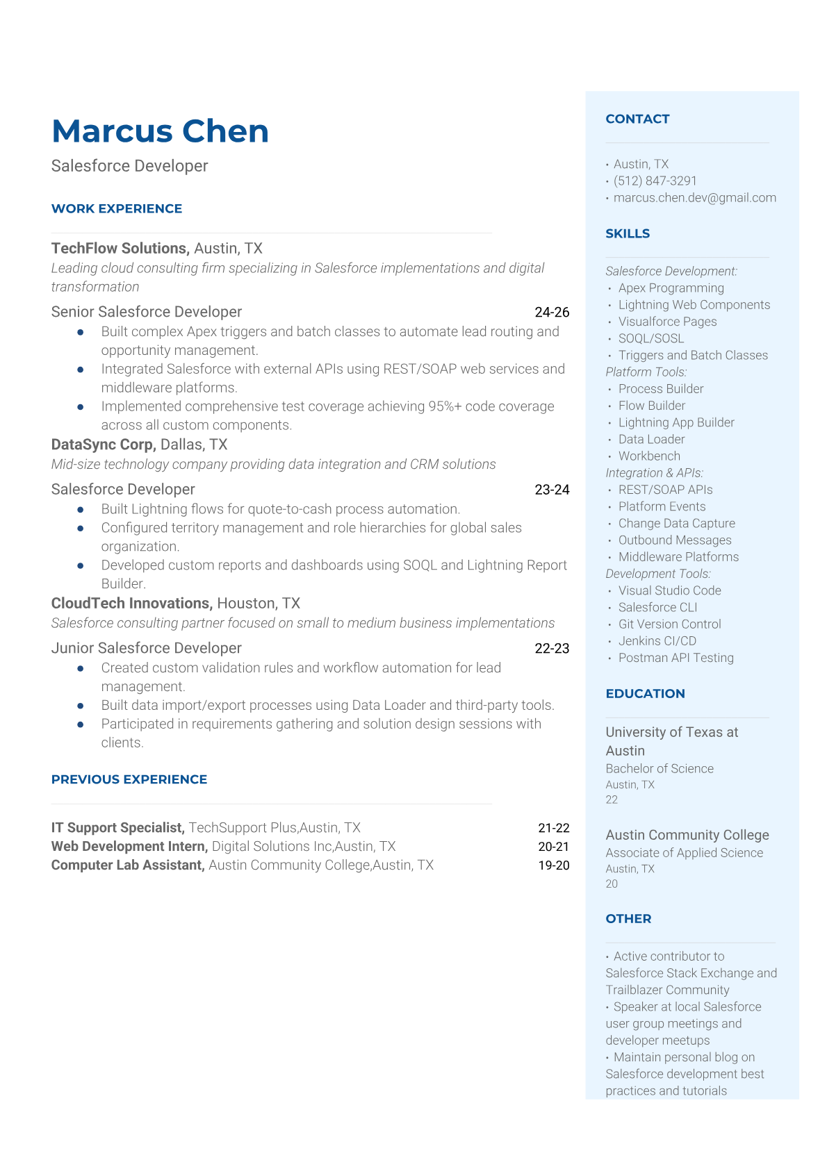 A Salesforce Developer designs, builds, and customizes applications on the Salesforce platform using Apex, Lightning Web Components, and declarative tools. They work with business stakeholders to translate requirements into scalable solutions, integrate third-party systems, and maintain data integrity across complex CRM environments. The role requires strong technical skills in Salesforce development along with understanding of business processes and user experience design. An ATS-friendly resume is crucial because Salesforce recruiting teams use automated screening to filter for specific certifications, technical skills, and platform experience. Without proper keyword optimization for terms like Apex, Lightning, SOQL, and relevant Salesforce clouds, qualified developers often get filtered out before human recruiters can evaluate their technical capabilities.