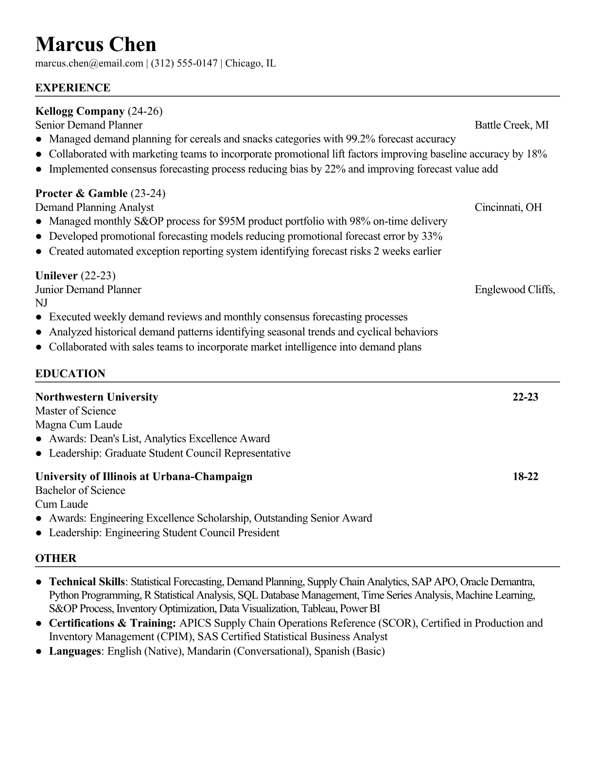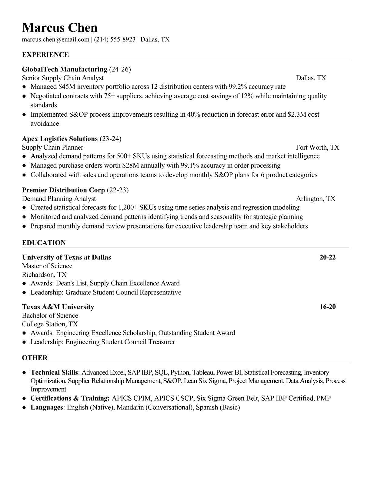 A Supply Chain Demand Planner forecasts product demand using statistical models, market analysis, and historical data to optimize inventory levels and production schedules. They collaborate with sales, marketing, and operations teams to balance supply and demand while minimizing costs and stockouts. The role requires strong analytical skills, proficiency in forecasting software, and deep understanding of supply chain dynamics. An ATS-friendly resume is crucial because supply chain organizations use automated systems to screen for specific technical skills like demand planning software (SAP APO, Oracle Demantra), statistical analysis tools, and supply chain certifications. Without proper keyword optimization and clear formatting, qualified demand planners may be filtered out before recruiters can evaluate their forecasting accuracy and inventory optimization achievements.