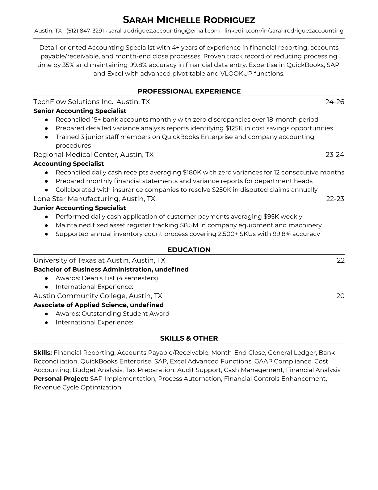 Professional accounting specialist resume templates optimized for ATS systems. Includes essential keywords like GAAP, QuickBooks, and financial reporting. Used by accounting professionals at top companies.