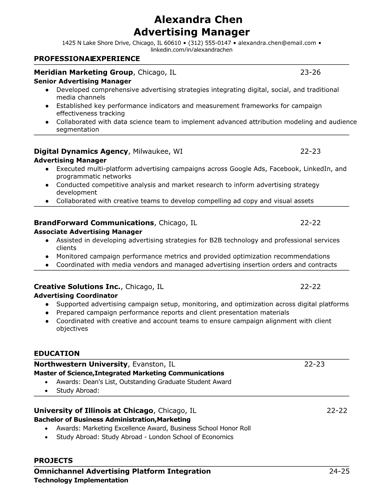 Professional advertising manager resume templates optimized for ATS systems. Includes campaign management keywords, digital advertising platforms, and performance metrics that recruiters seek.
