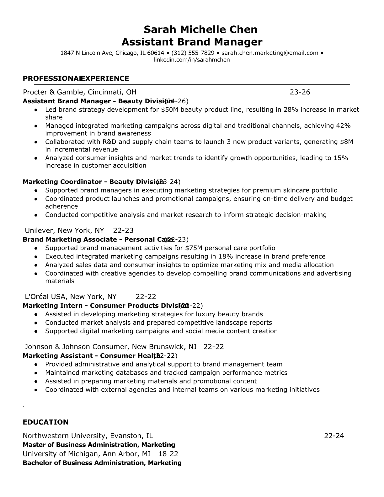 Professional Assistant Brand Manager resume templates optimized for marketing agencies and consumer goods companies. Includes brand management keywords and campaign metrics formatting.