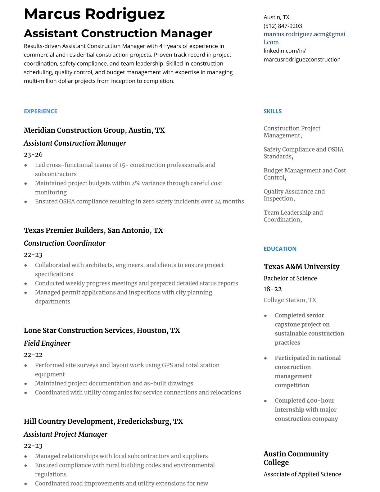 Assistant Construction Manager Resume Templates - ATS-Optimized