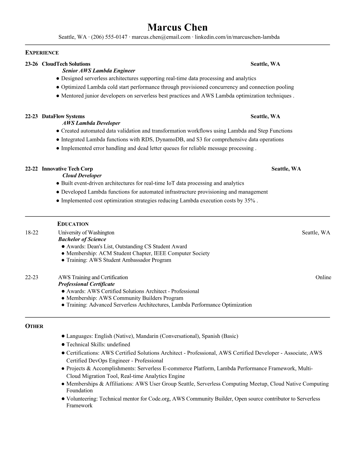 Professional AWS Lambda Engineer resume templates optimized for serverless development roles. Highlight your cloud architecture skills, AWS certifications, and Lambda expertise with ATS-friendly formatting.