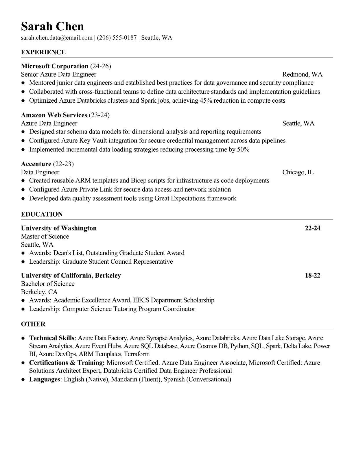 Professional Azure Data Engineer resume templates optimized for ATS systems. Highlight your Azure certifications, data pipeline experience, and cloud architecture skills with our specialized templates.