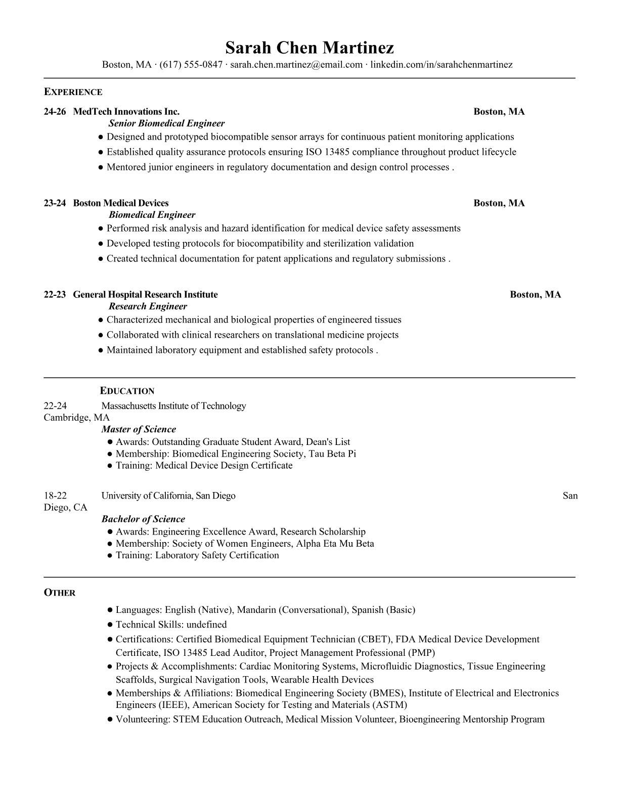 Biomedical Engineer Resume Templates - ATS-Optimized for Medical Device Companies