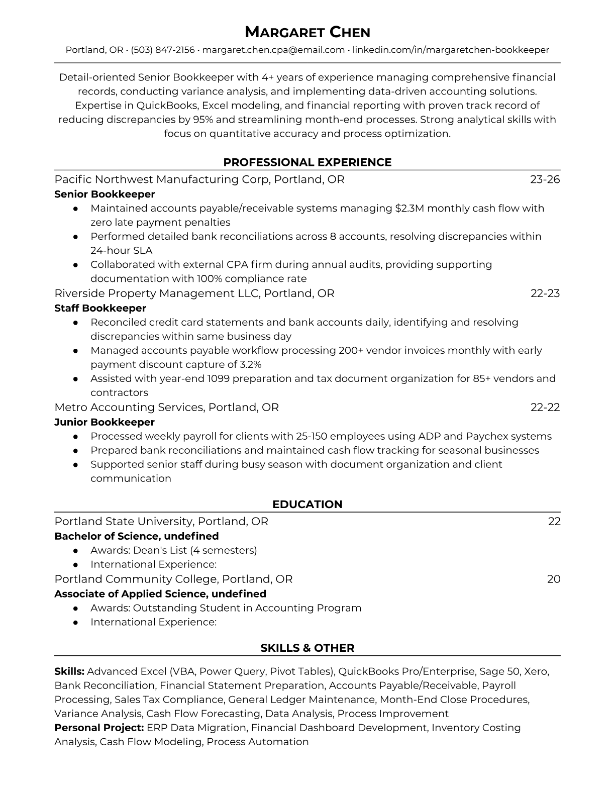 Professional Bookkeeper Resume Templates - ATS-Optimized