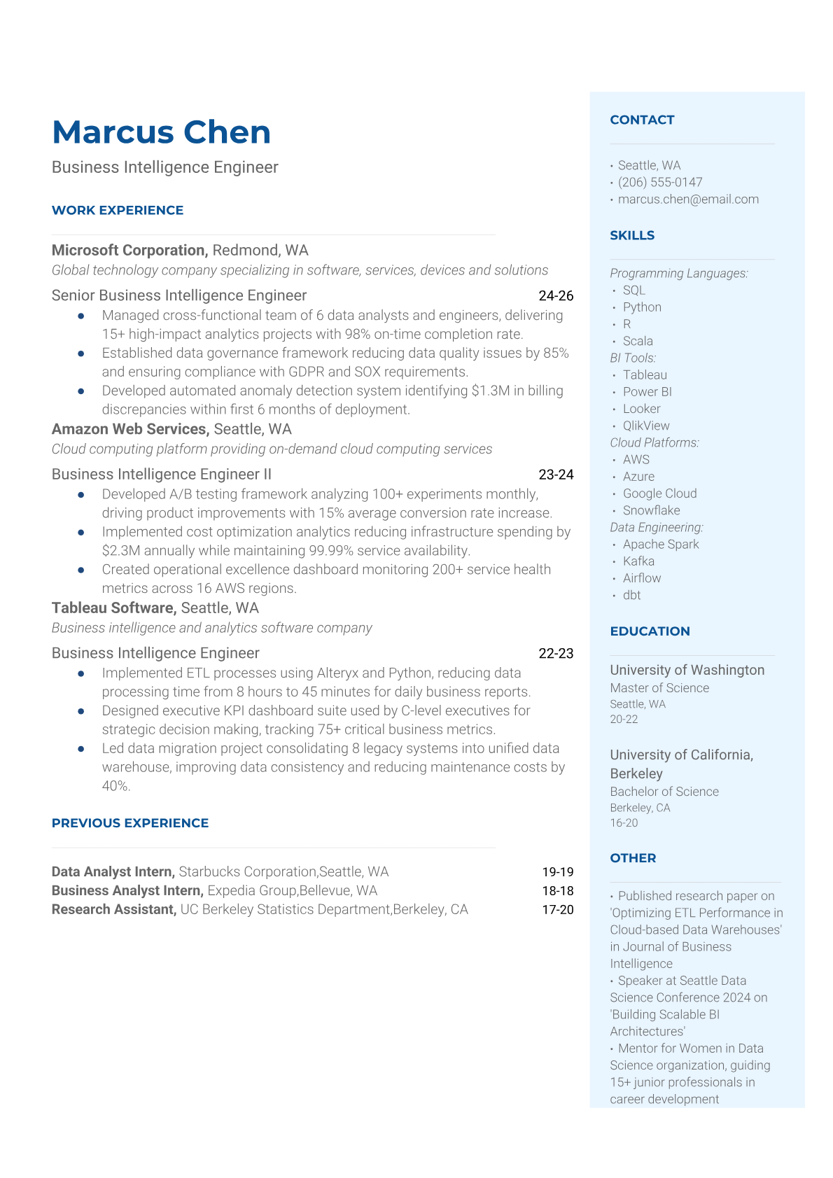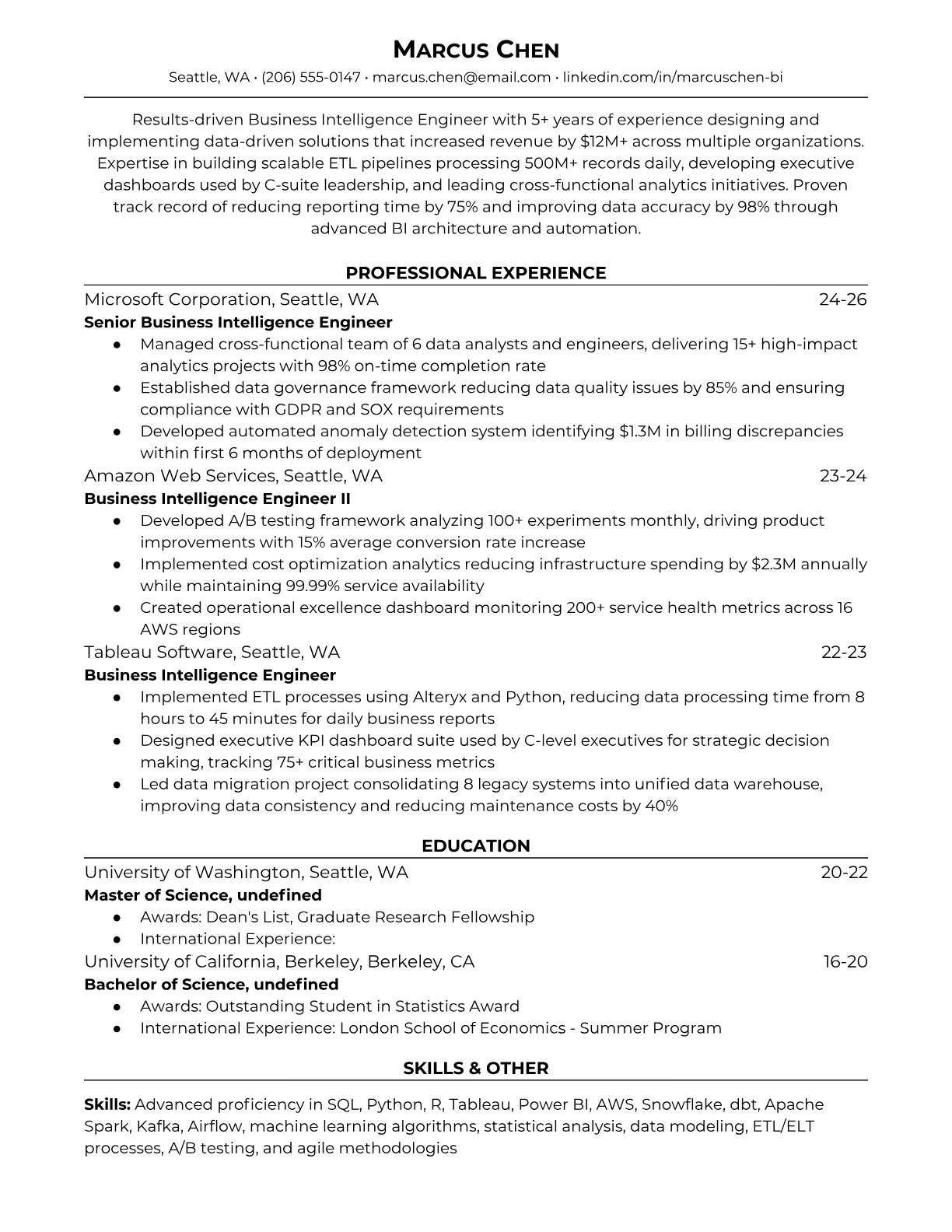 Business Intelligence Engineer Resume Templates - ATS-Optimized