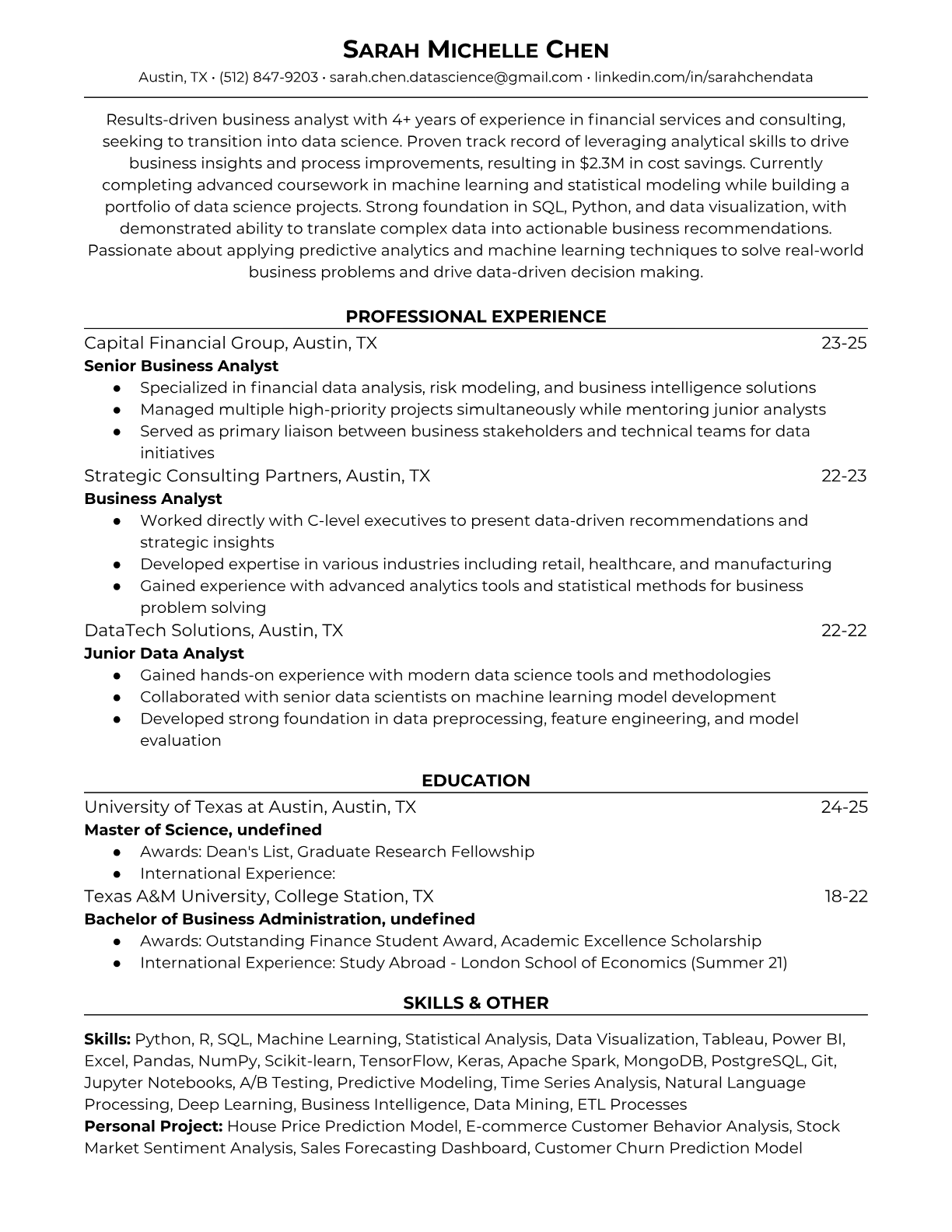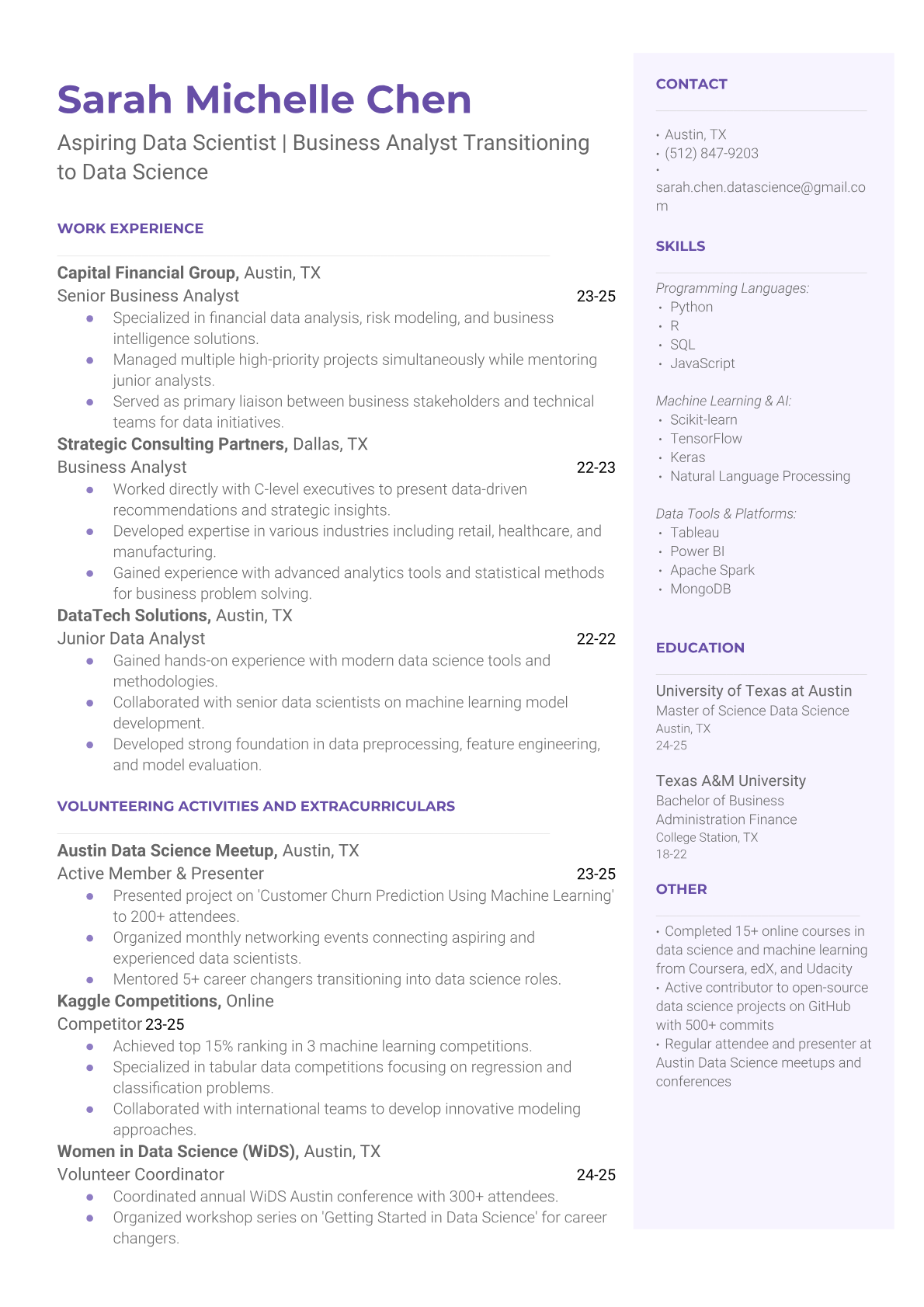 Professional resume templates for transitioning into data science. Choose from narrative, ATS-optimized, or academic formats. Highlight transferable skills and data science projects effectively.
