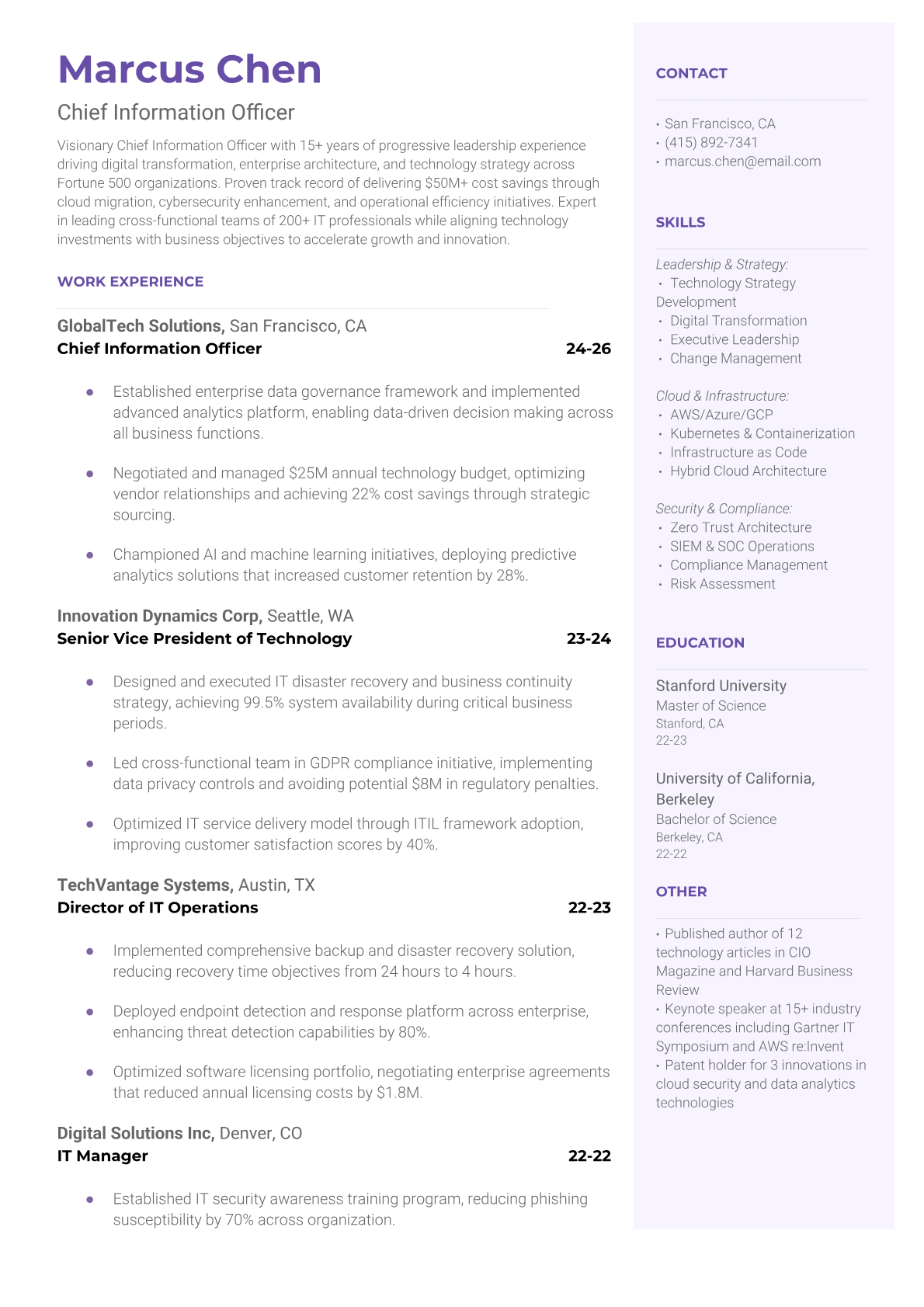 Professional CIO resume templates optimized for executive search and Fortune 500 ATS systems. Highlight your technology leadership, digital transformation experience, and strategic IT management skills.