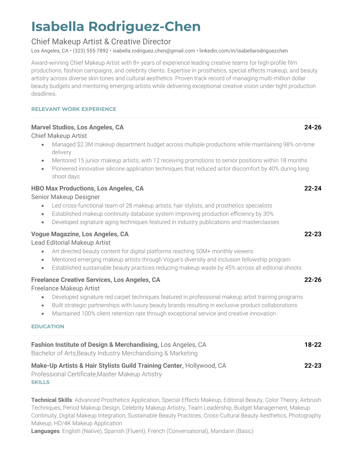 Professional resume templates for Chief Makeup Artists. Optimized for film, TV, fashion, and beauty industry ATS systems with makeup artistry keywords and portfolio highlights.