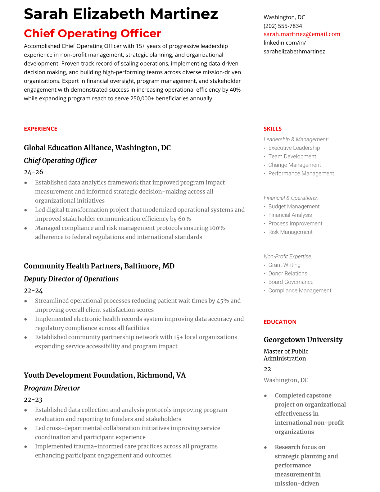 Professional resume templates for Chief Operating Officer positions in non-profit organizations. Executive-level formatting optimized for board recruitment and search firms.