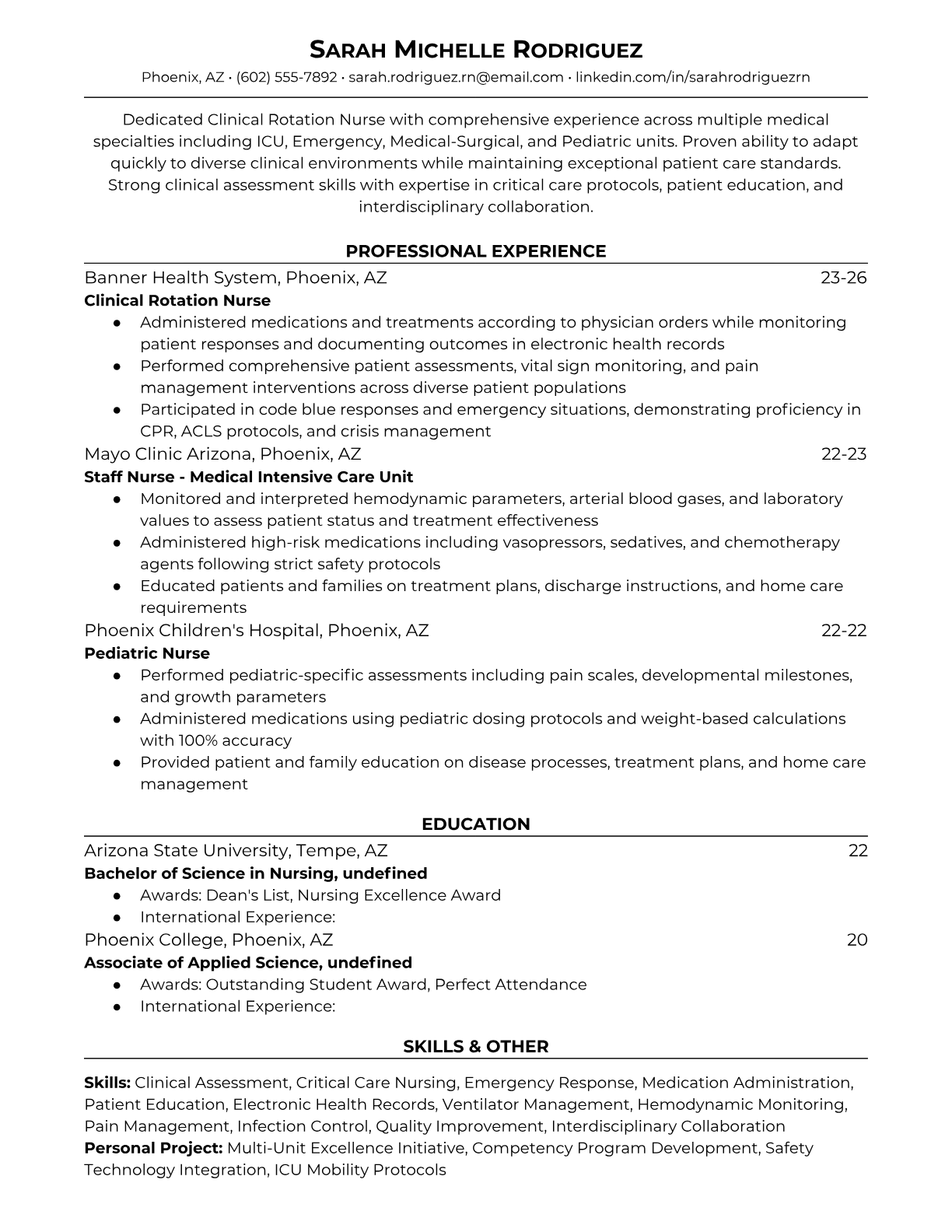 Professional Clinical Rotation Nurse resume templates optimized for healthcare ATS systems. Highlight your clinical experience across multiple specialties and nursing certifications effectively.
