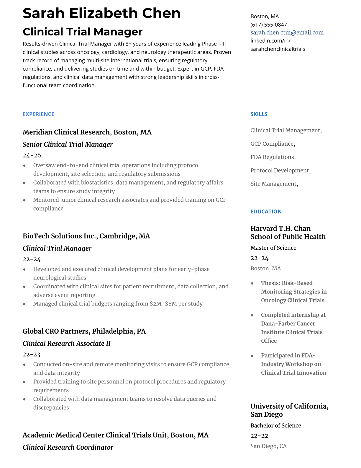 Professional Clinical Trial Manager resume templates optimized for pharmaceutical and CRO ATS systems. Includes clinical research keywords, regulatory compliance experience, and project management skills that get interviews.