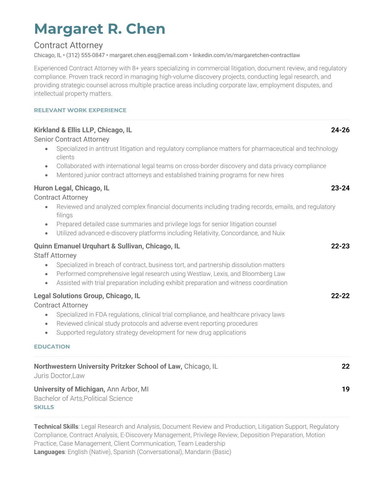 Professional Contract Attorney resume templates optimized for legal staffing agencies and corporate ATS systems. Choose from traditional legal formats or modern project-based layouts.