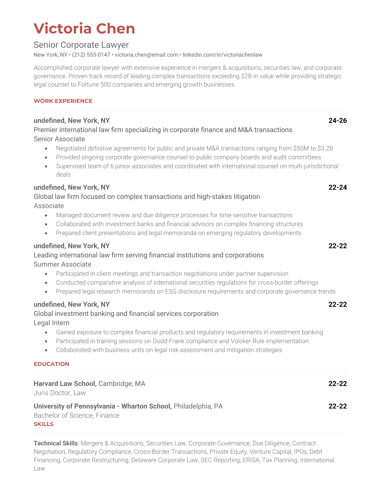 Professional Corporate Lawyer resume templates optimized for law firms and corporate legal departments. Highlight M&A experience, securities law expertise, and bar admissions with ATS-friendly formatting.