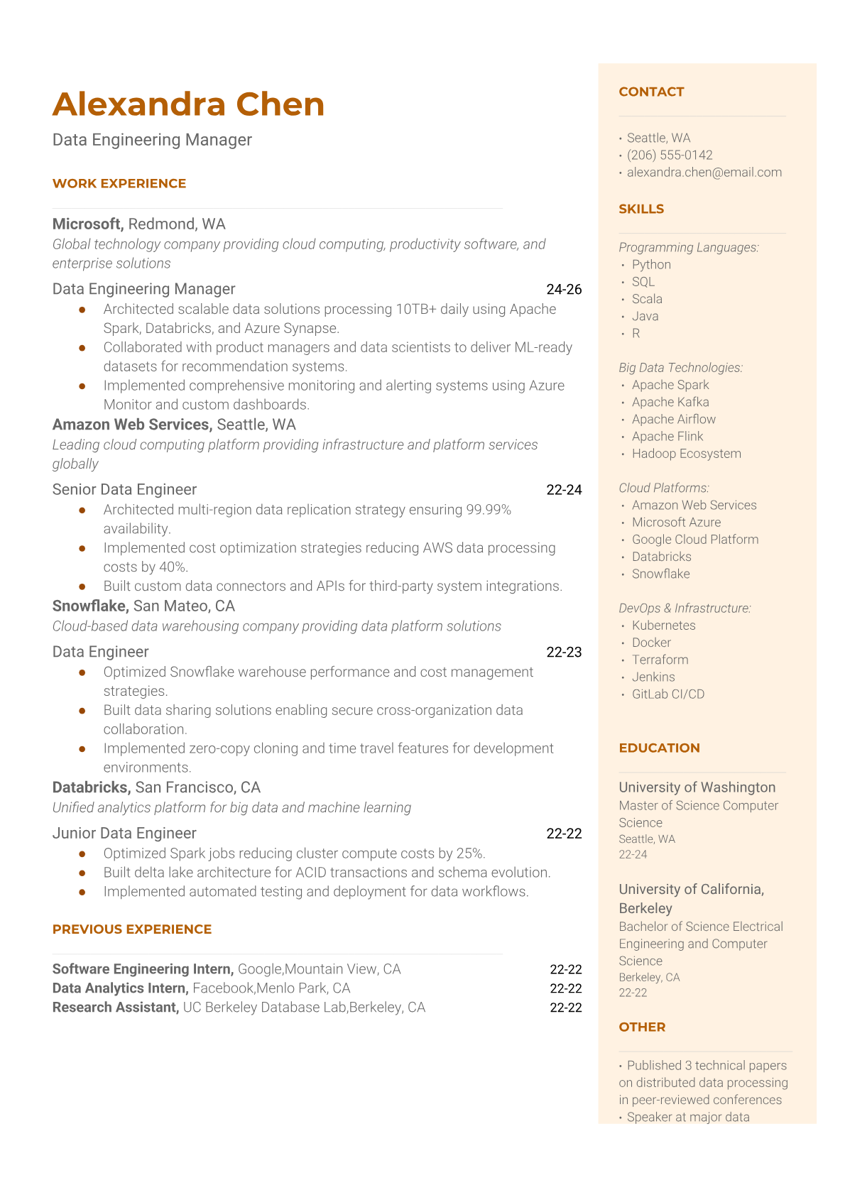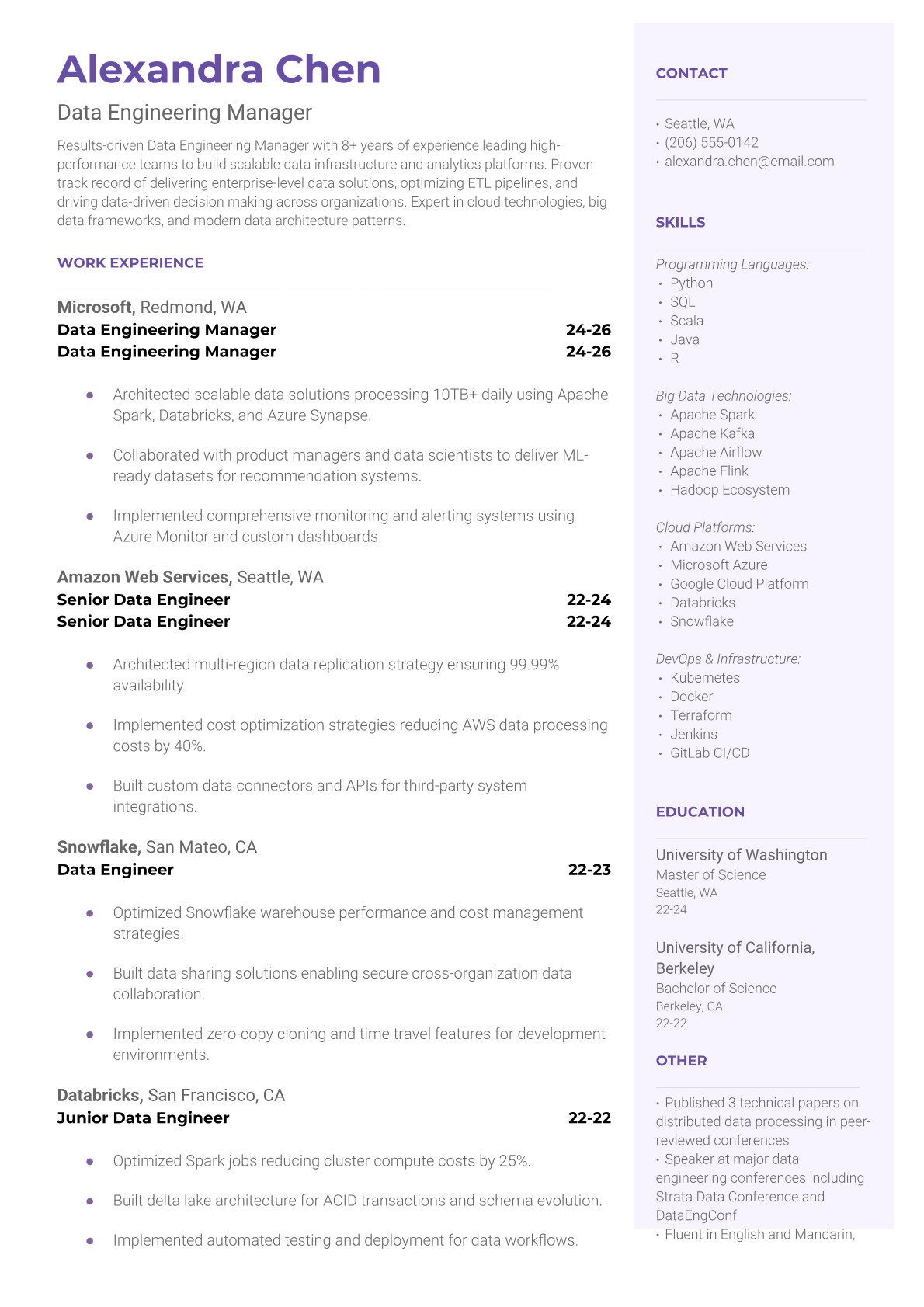 Professional Data Engineering Manager resume templates optimized for ATS systems. Highlight your technical leadership, data infrastructure experience, and team management skills with our proven templates.