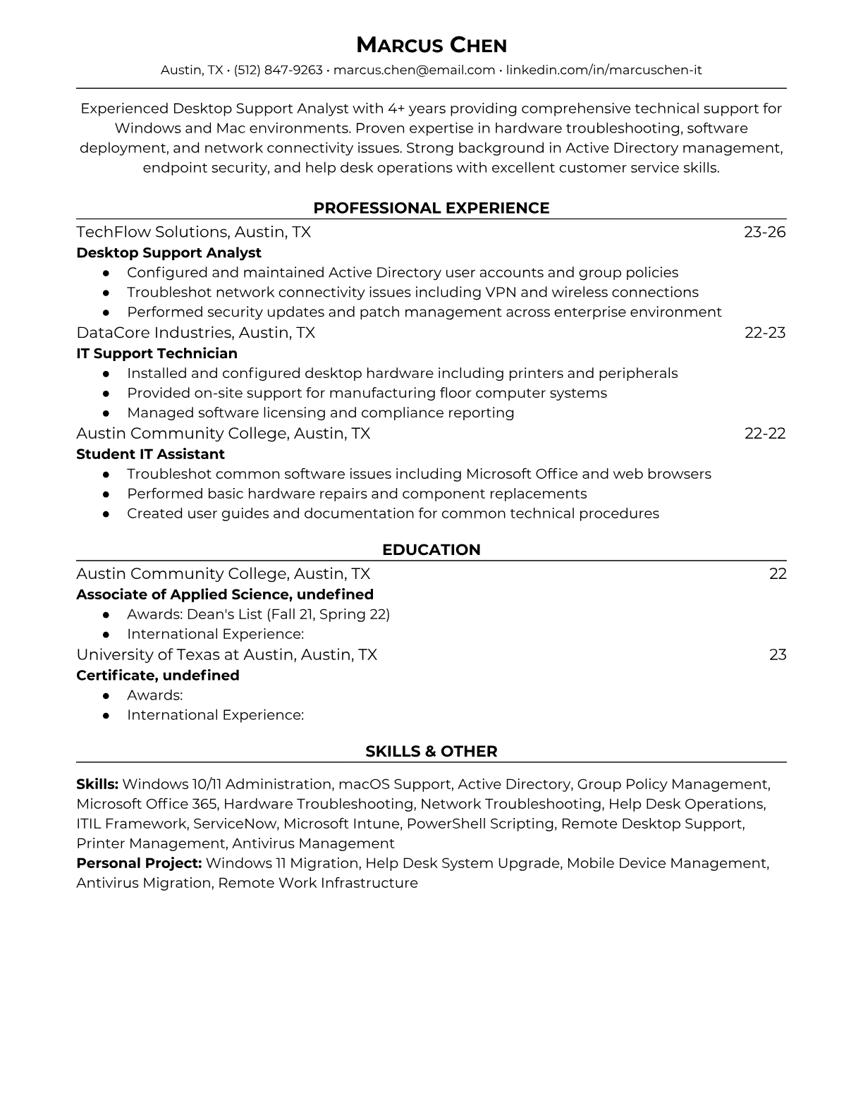 Professional Desktop Support Analyst resume templates optimized for ATS systems. Includes technical skills, certifications, and help desk experience formatting.