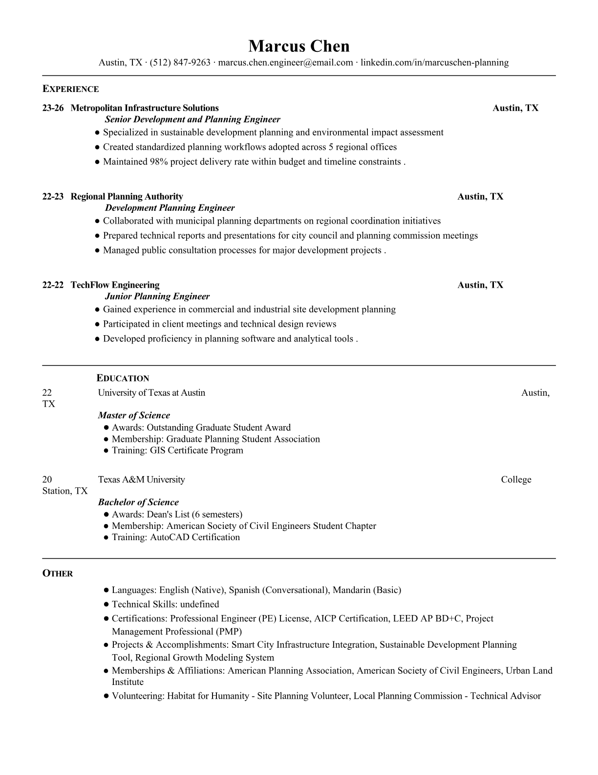Professional Development and Planning Engineer resume templates optimized for ATS systems. Highlight your project management, technical skills, and engineering expertise with our specialized templates.