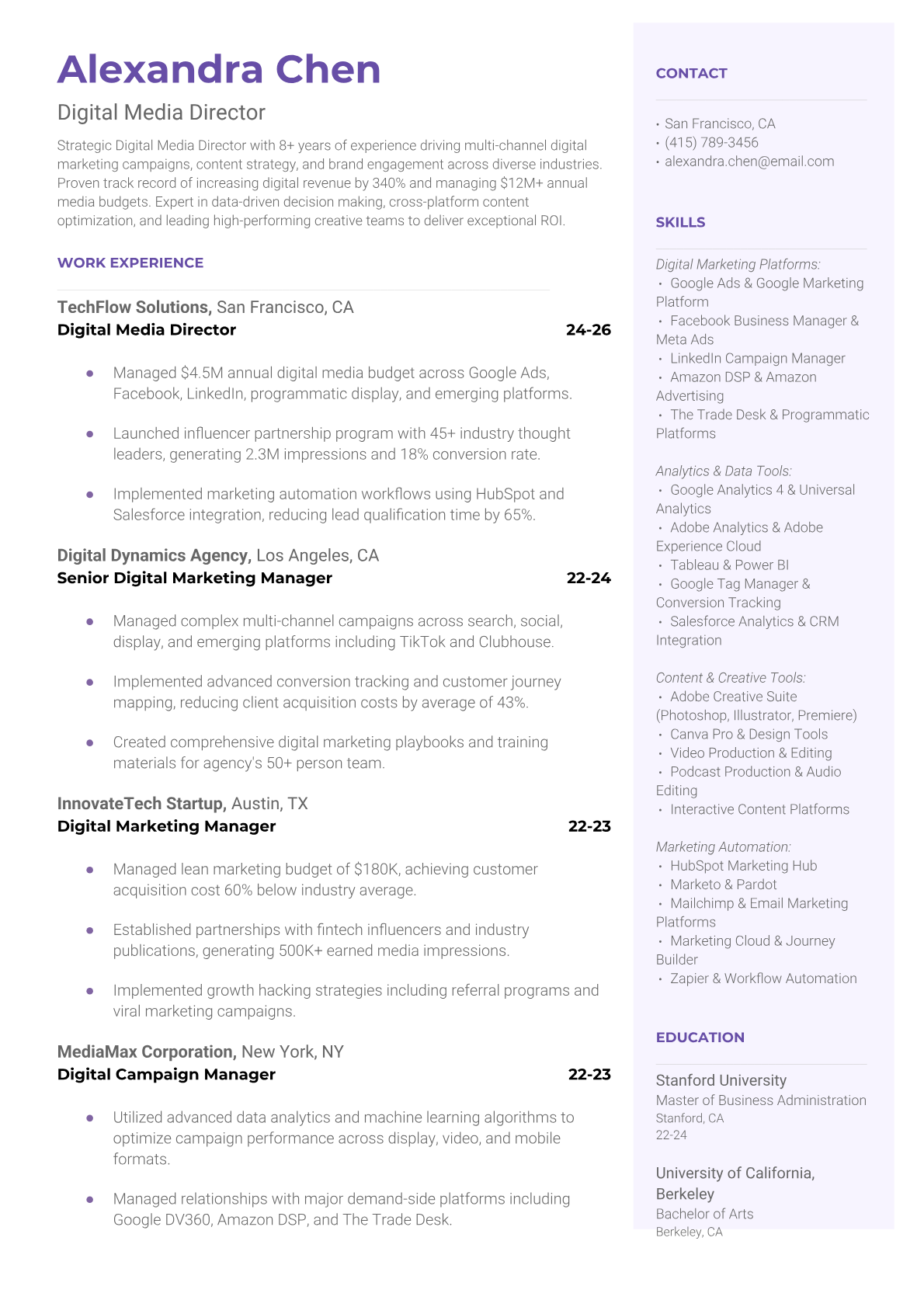 Professional Digital Media Director resume templates optimized for ATS systems. Includes digital marketing keywords, campaign metrics formatting, and proven layouts used by directors at top agencies and corporations.