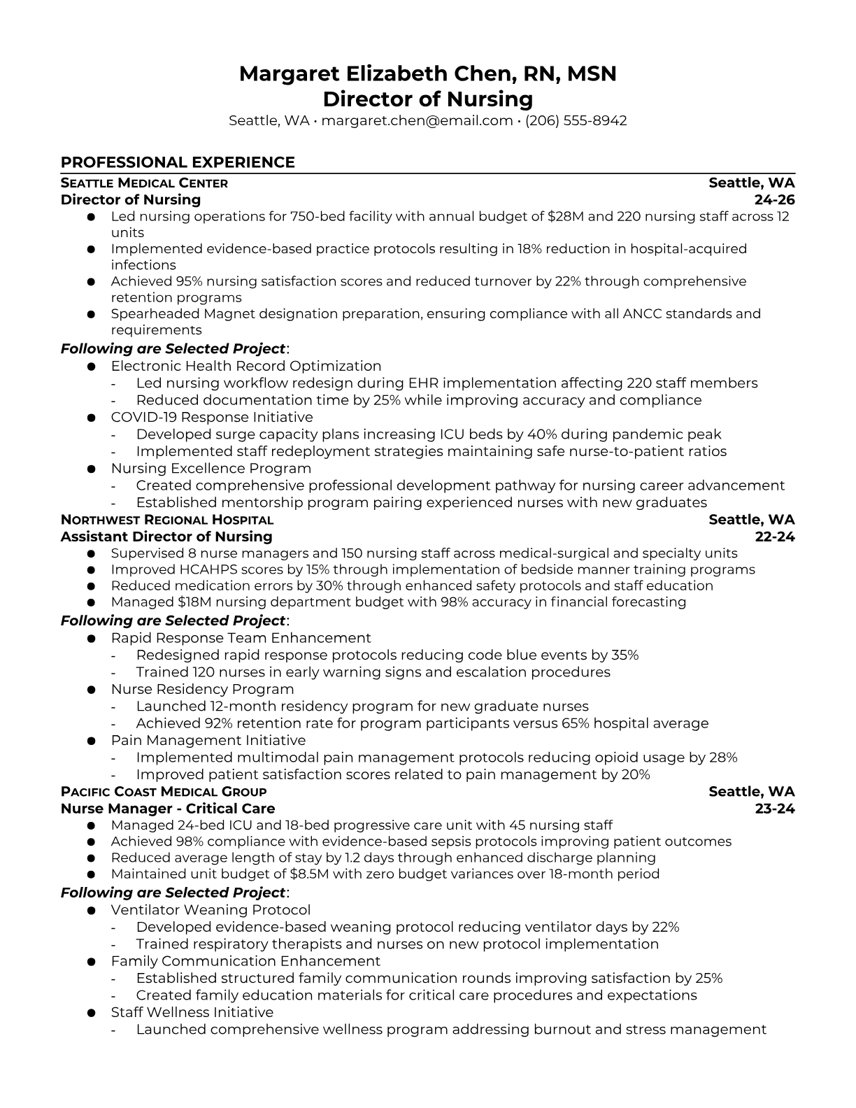 Professional Director of Nursing resume templates optimized for healthcare ATS systems. Highlight nursing leadership, regulatory compliance, and staff management experience.