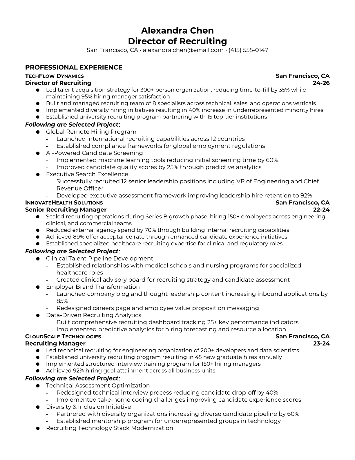 Professional Director of Recruiting resume templates optimized for ATS systems. Choose from executive sidebar or progression tracker formats designed for recruiting leadership roles.