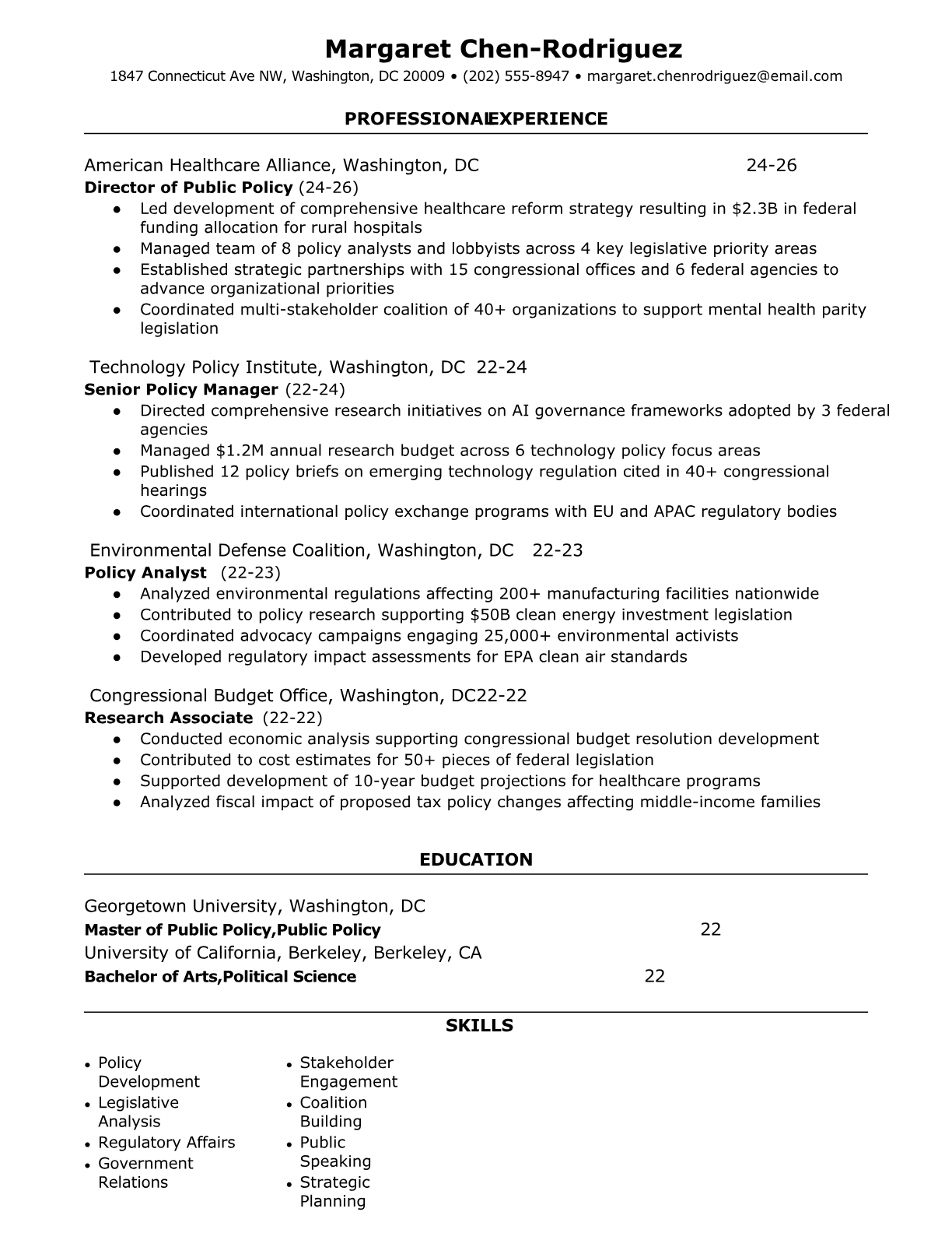 Professional resume templates for Director of Public Policy roles. Choose from executive sidebar and legal professional formats optimized for government relations and corporate policy positions.
