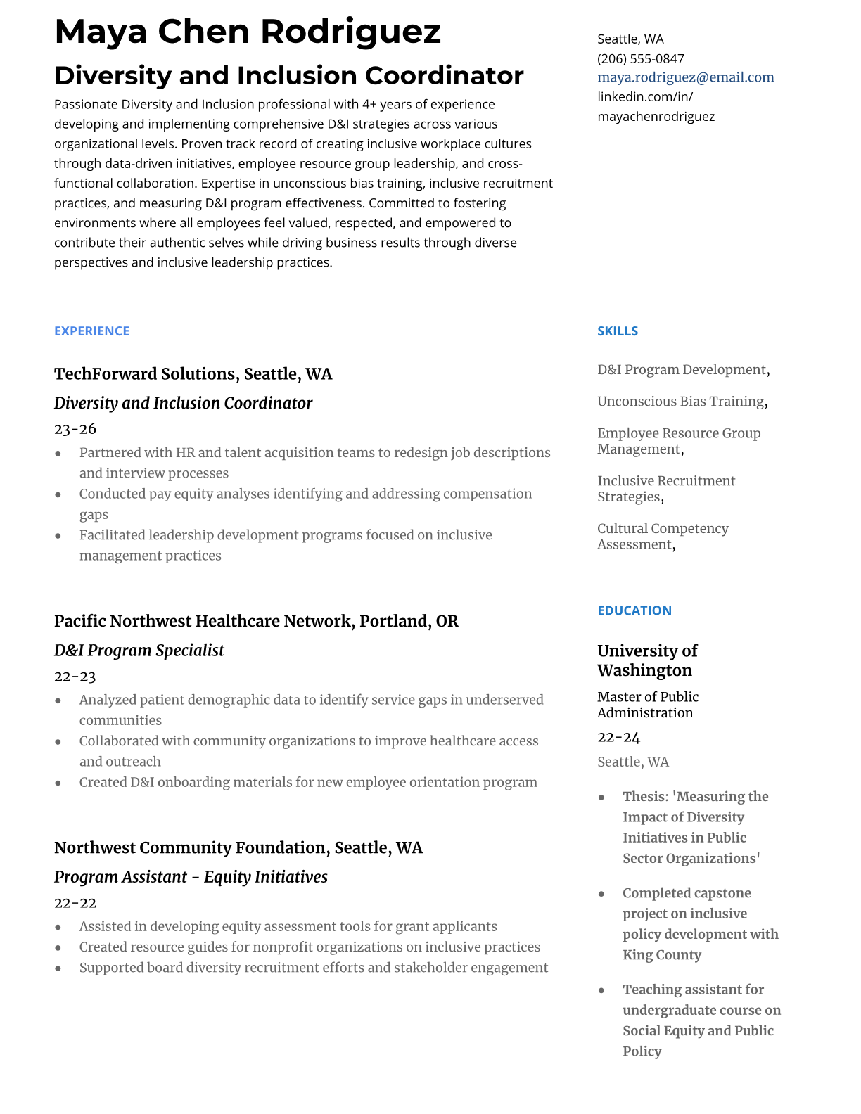 Professional resume templates for Diversity and Inclusion Coordinators. ATS-friendly formats with D&I keywords, program management focus, and proven success at top companies.