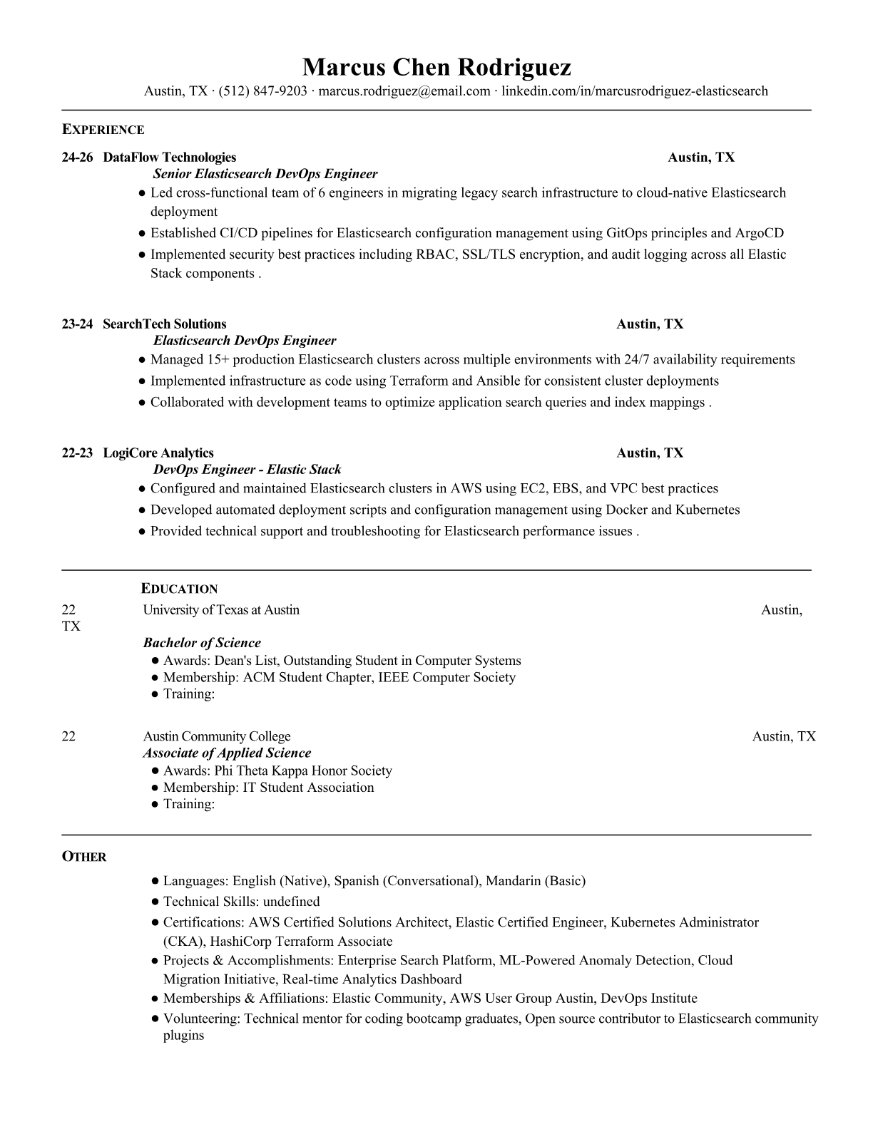Professional resume templates for Elasticsearch DevOps Engineers. Choose from technical specialist or structured timeline formats, optimized for ATS systems with essential DevOps and Elastic Stack keywords.