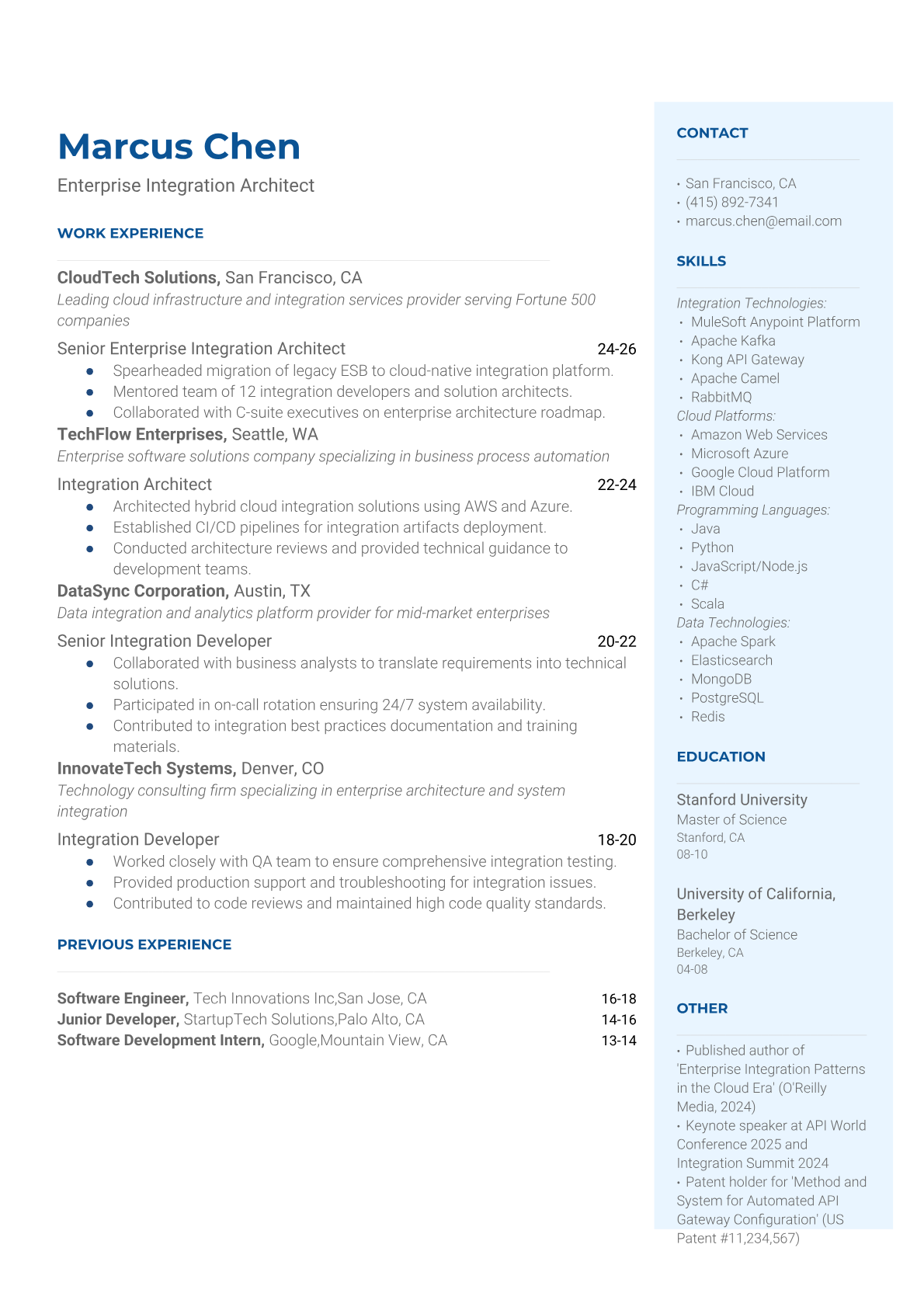 Professional Enterprise Integration Architect resume templates optimized for ATS systems. Highlight your system integration expertise, architectural skills, and enterprise technology experience with our specialized templates.