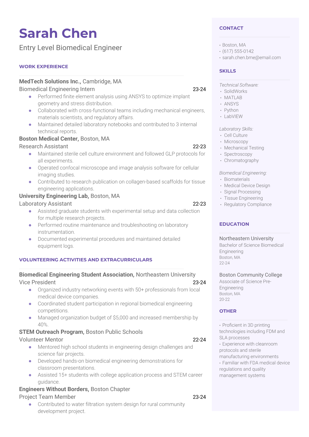 Entry Level Biomedical Engineer Resume Templates - ATS Optimized