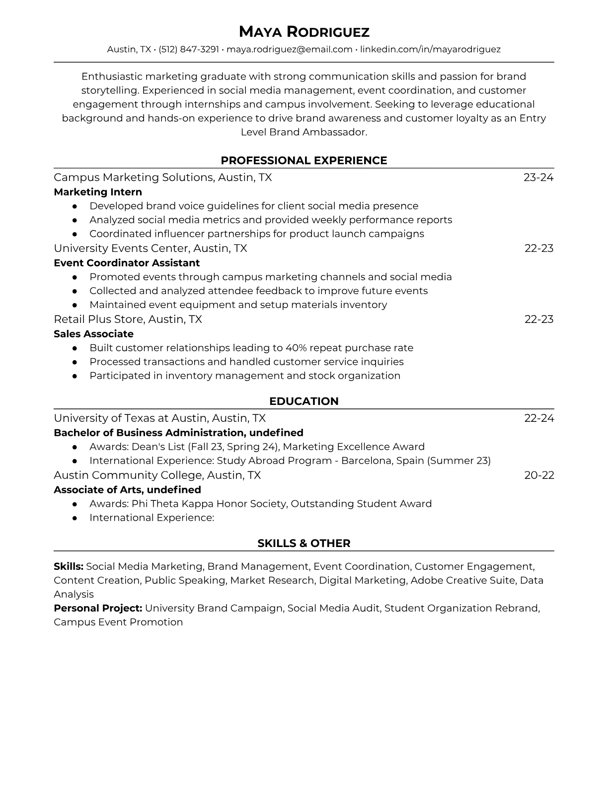 Entry Level Brand Ambassador Resume Templates - ATS Optimized