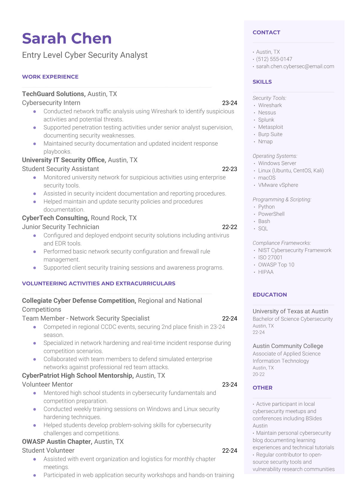 Entry Level Cyber Security Analyst Resume Templates - ATS Optimized