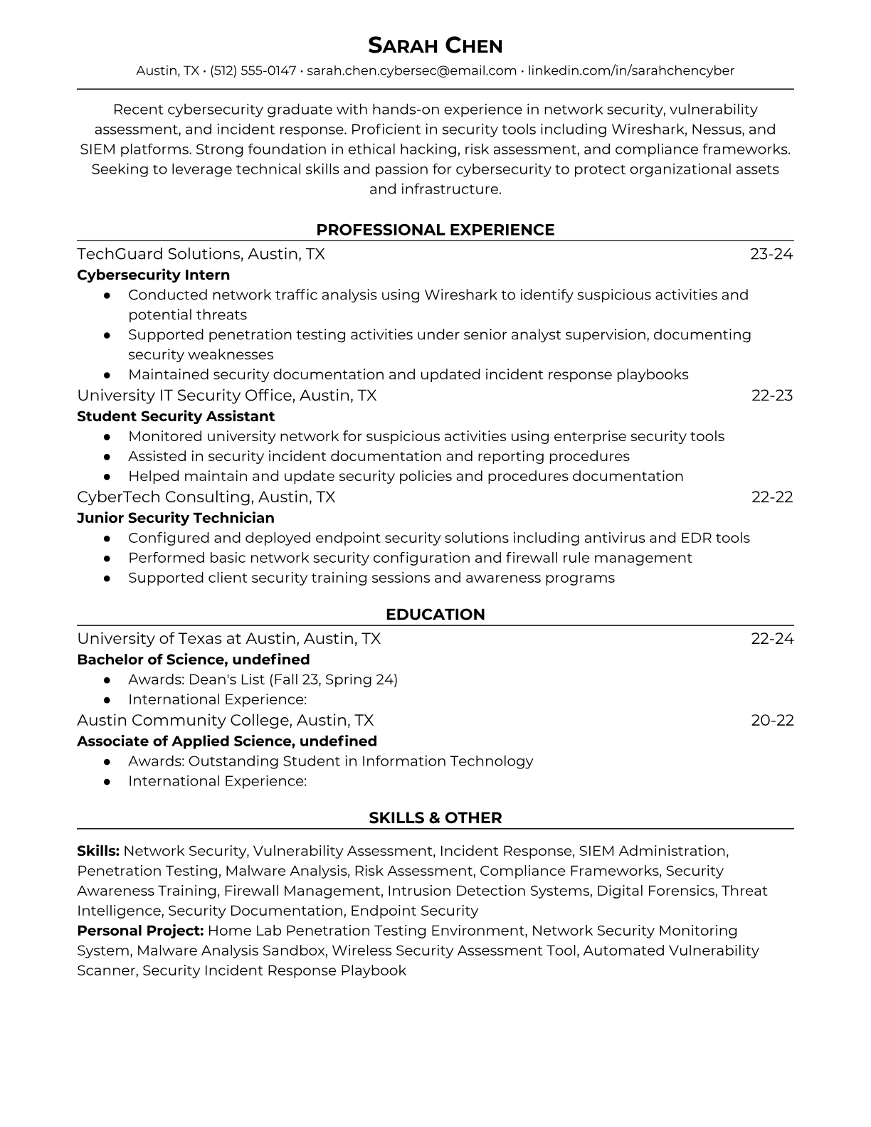 Professional resume templates for Entry Level Cyber Security Analyst positions. Optimized for ATS systems with security keywords, certifications, and technical skills formatting.