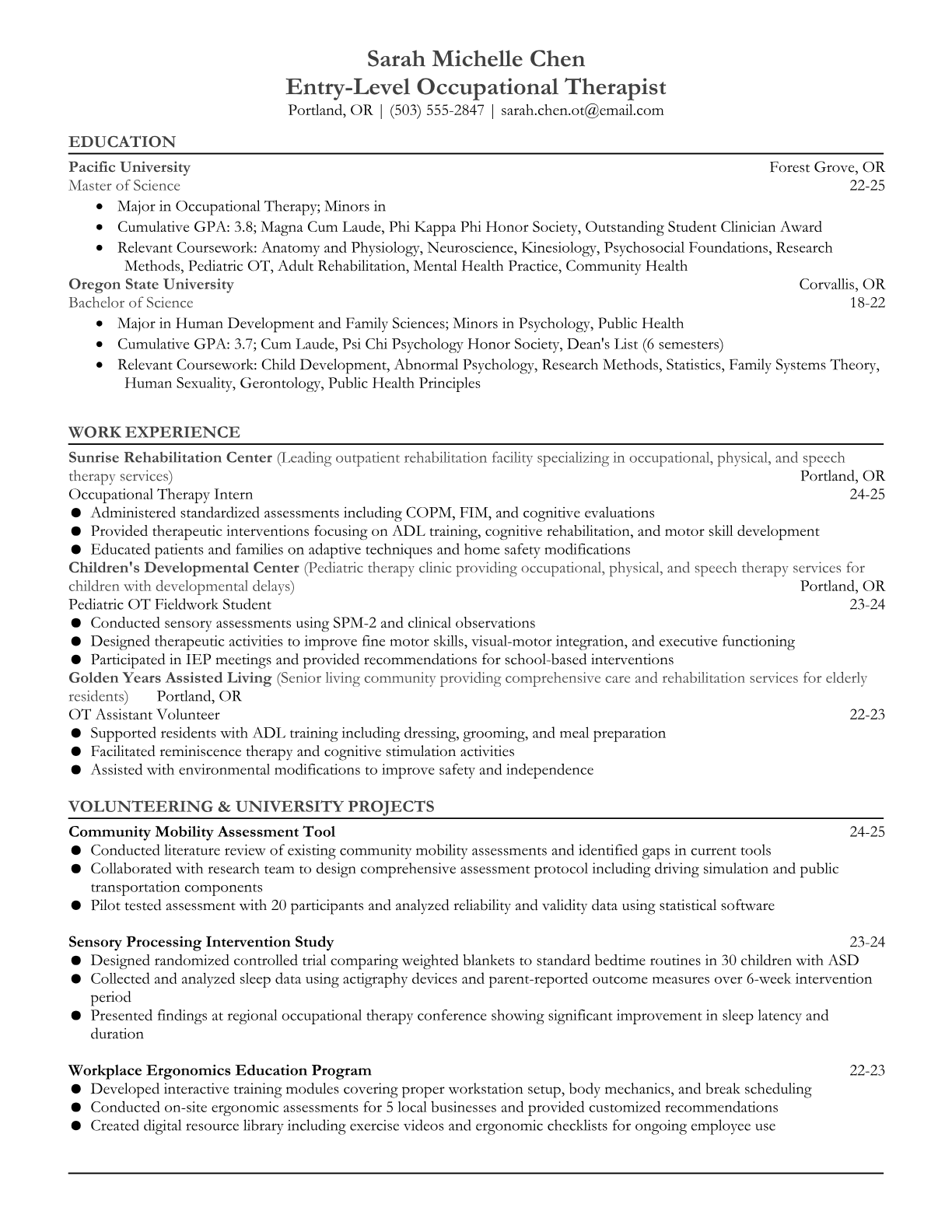Professional resume templates for entry-level occupational therapists. Optimized for healthcare ATS systems with clinical fieldwork experience and therapeutic skills formatting.