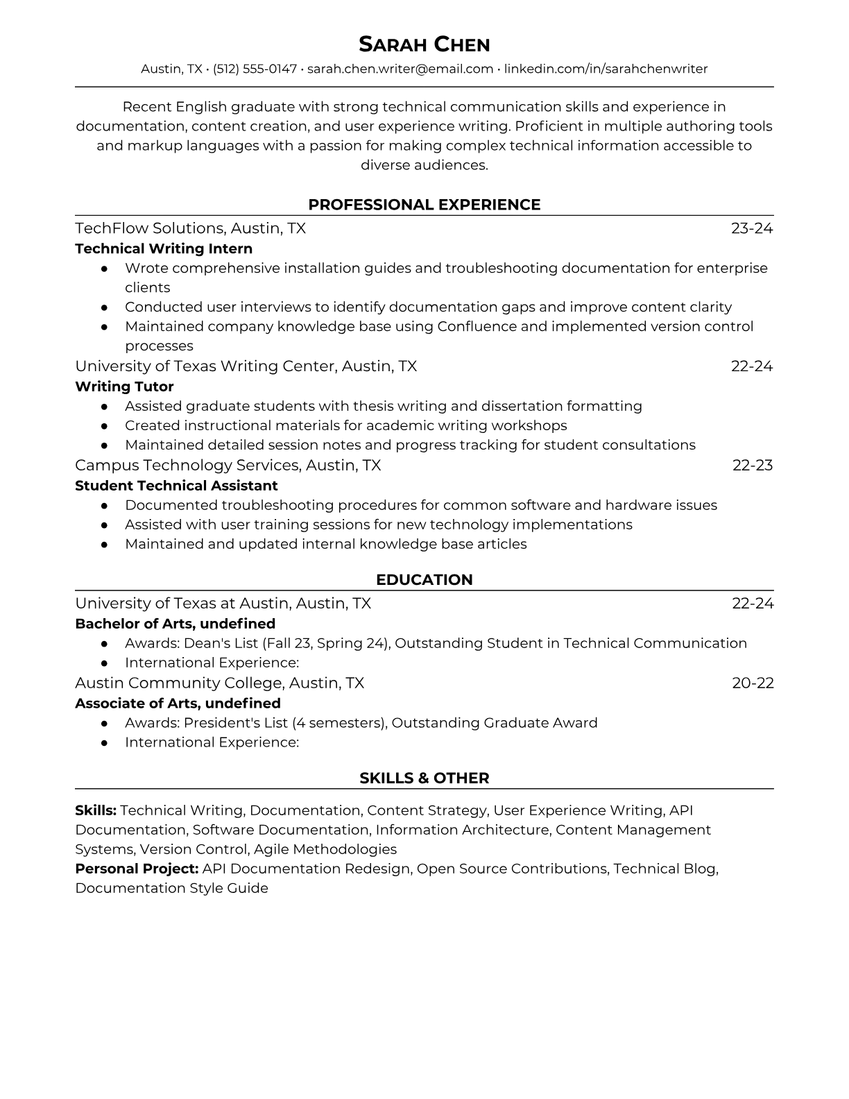 Professional resume templates for entry-level technical writers. Choose from academic-focused or ATS-optimized formats. Includes technical writing keywords and documentation tools.