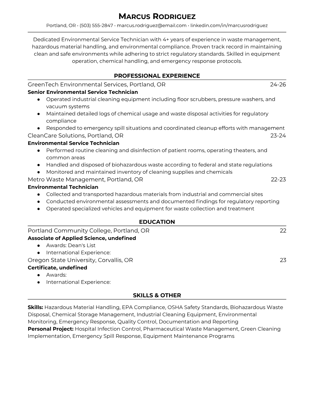 Professional Environmental Service Technician resume templates optimized for healthcare and facility management ATS systems. Includes infection control, OSHA compliance, and safety certification keywords.