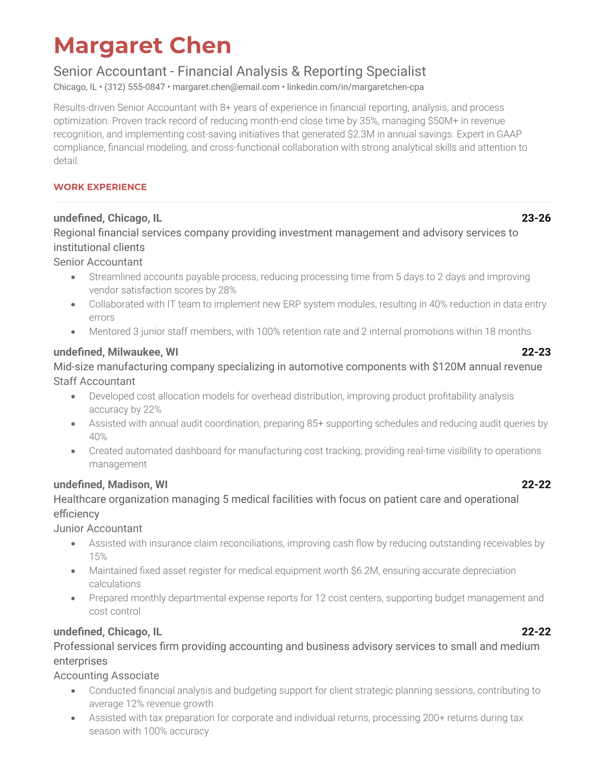 Professional resume templates for experienced accountants. Optimized for ATS systems with accounting keywords, GAAP compliance, and financial reporting achievements.
