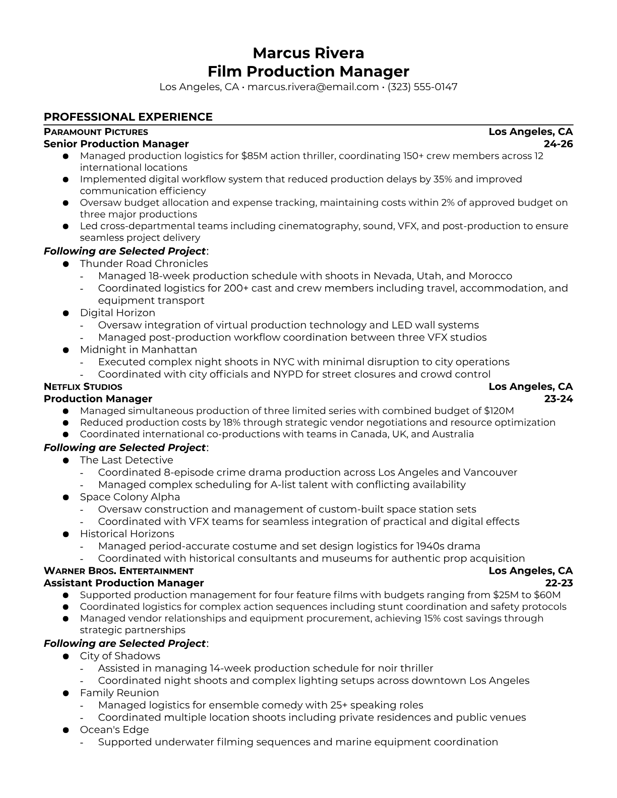 Professional Film Production Manager resume templates optimized for entertainment industry ATS systems. Highlight your project management, budgeting, and crew coordination experience with industry-specific keywords.