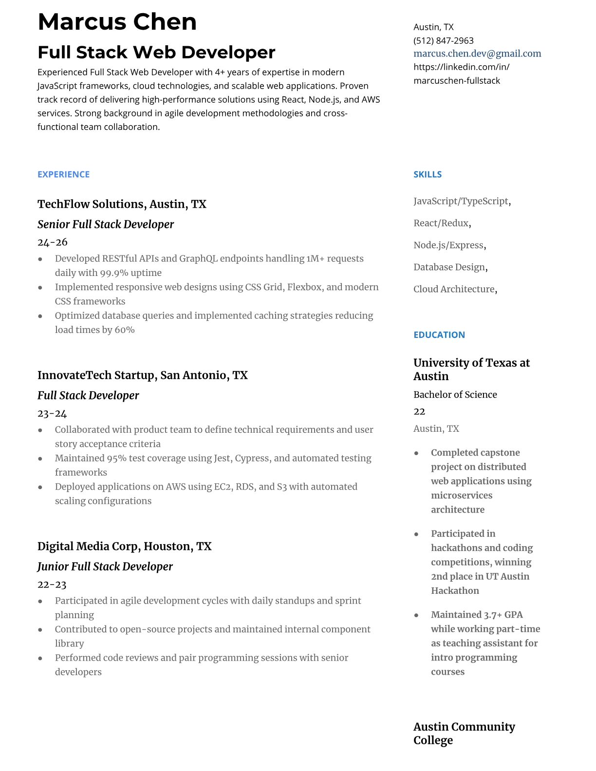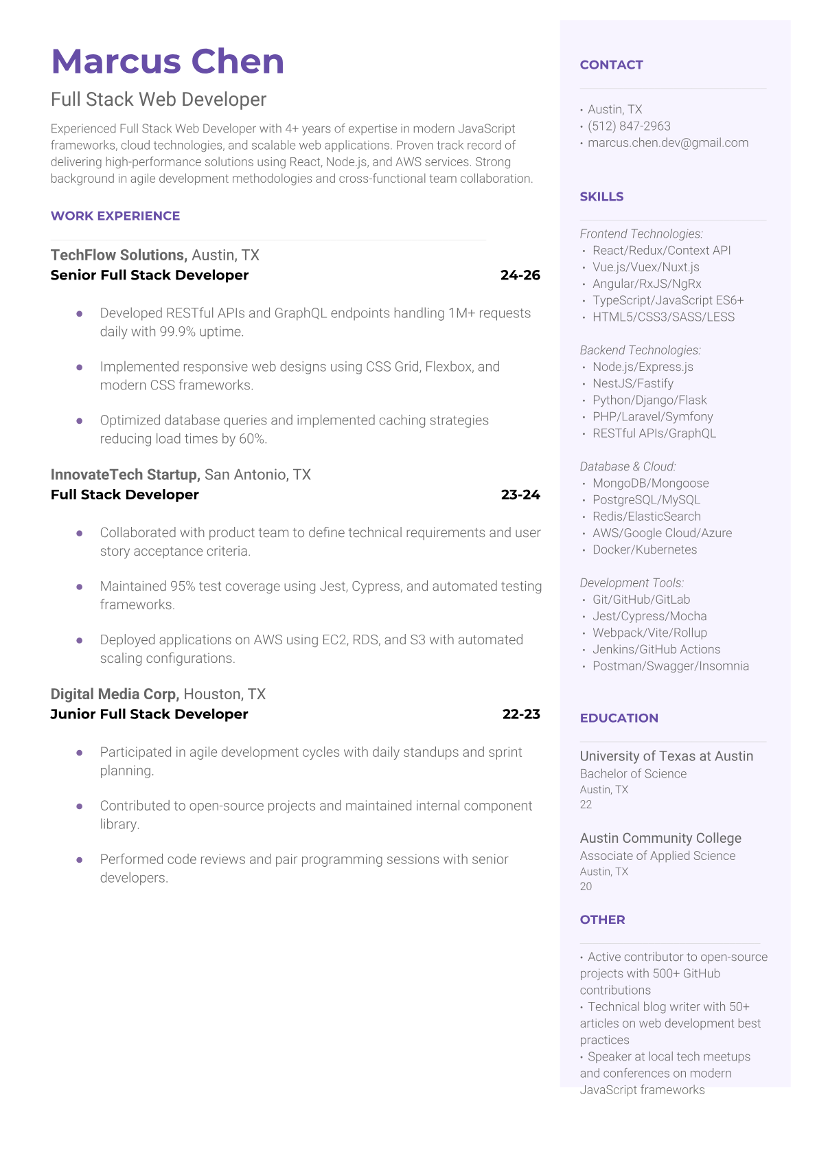Full Stack Web Developer Resume Templates - ATS Optimized