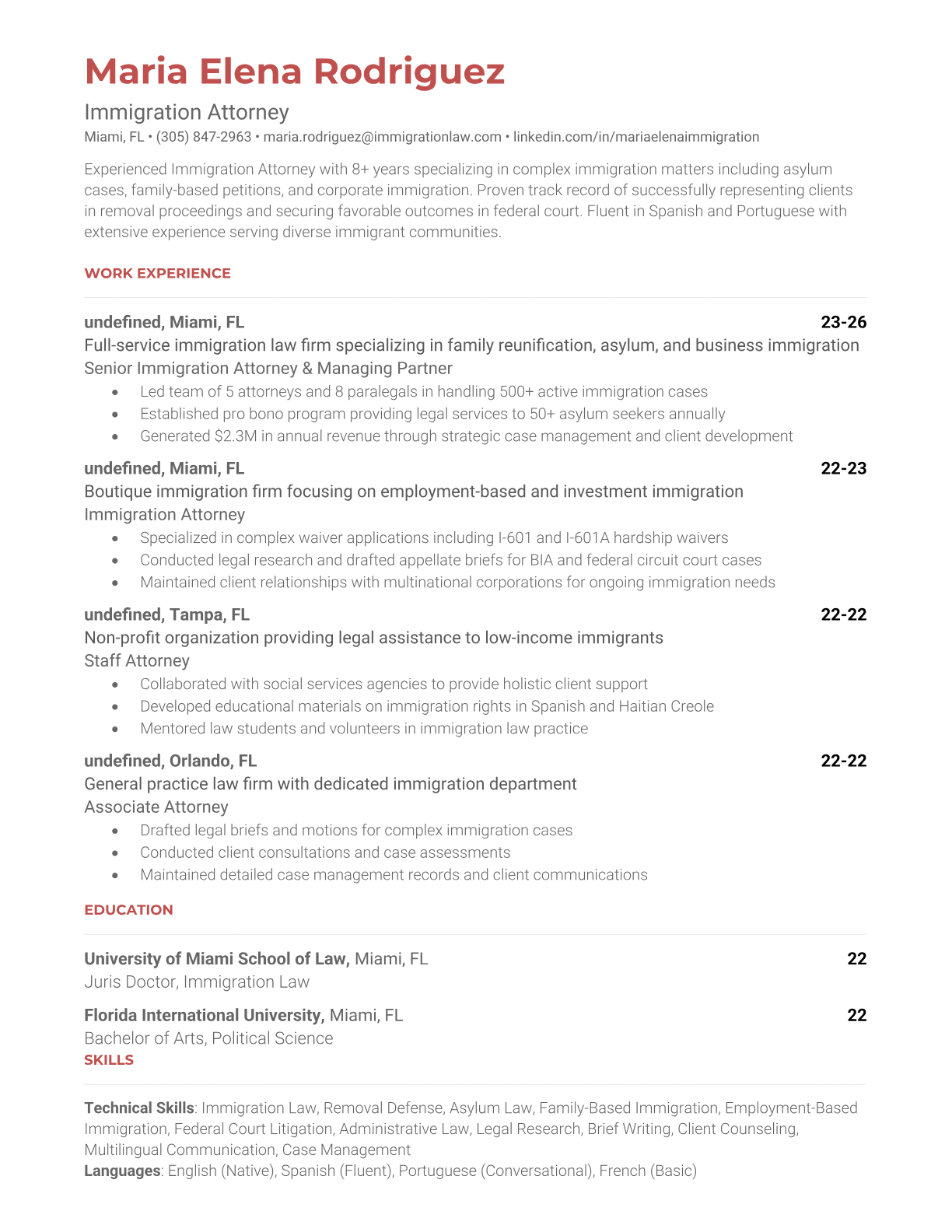 Professional Immigration Attorney resume templates optimized for law firms and legal organizations. Choose from specialized legal formats designed for immigration law professionals.