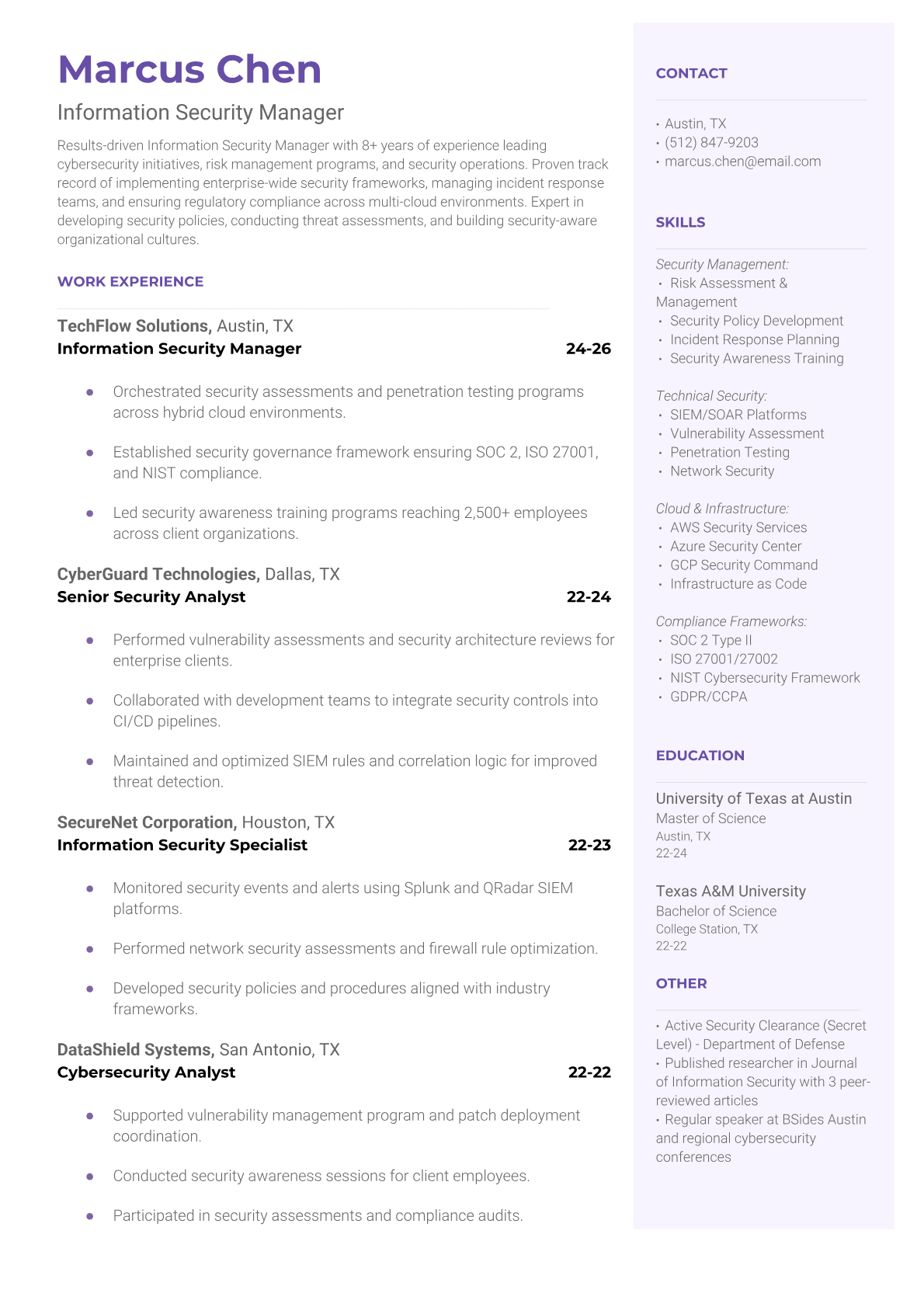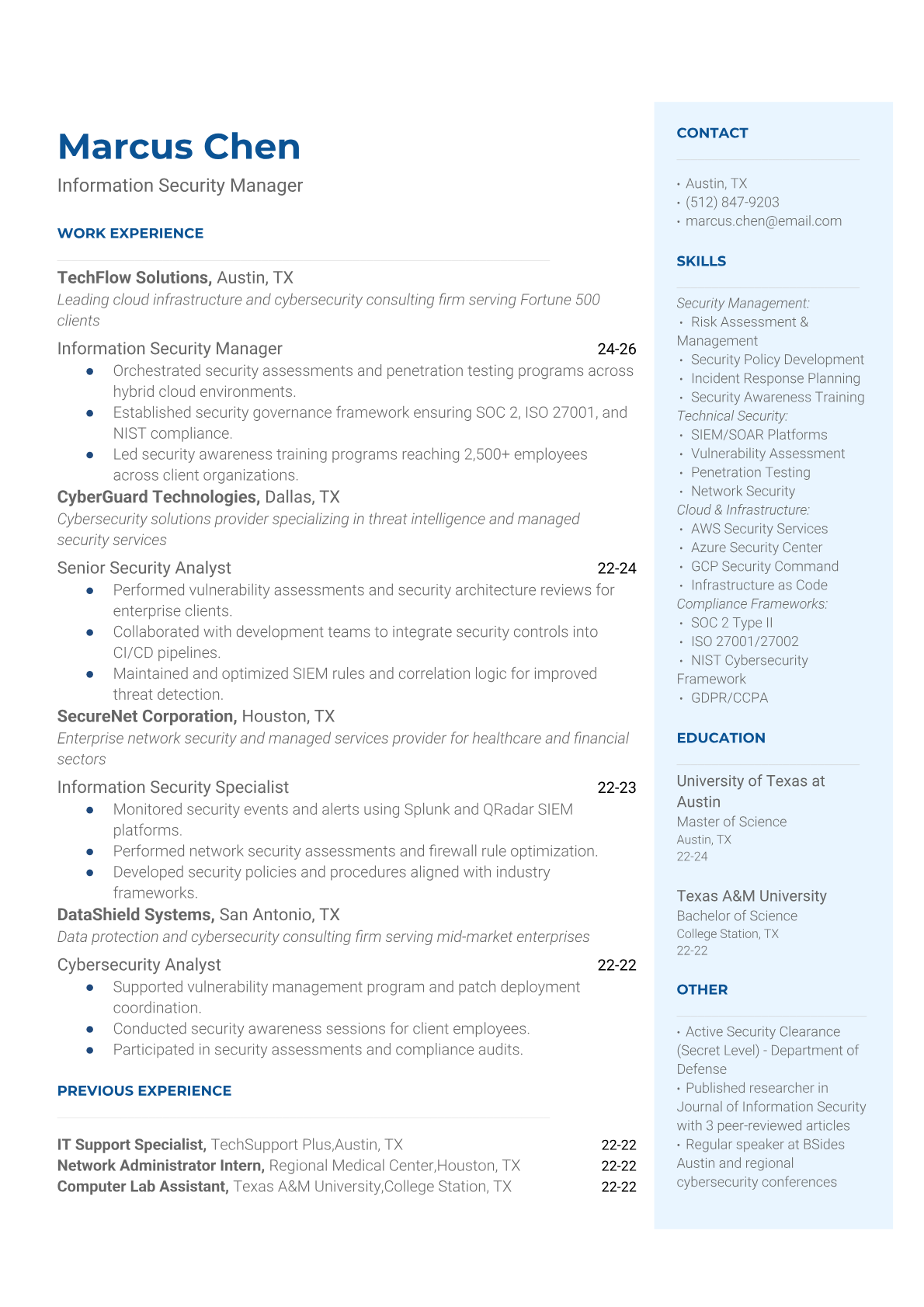 Professional Information Security Manager resume templates optimized for cybersecurity leadership roles. Includes CISSP, CISM keywords and compliance frameworks to pass ATS screening.