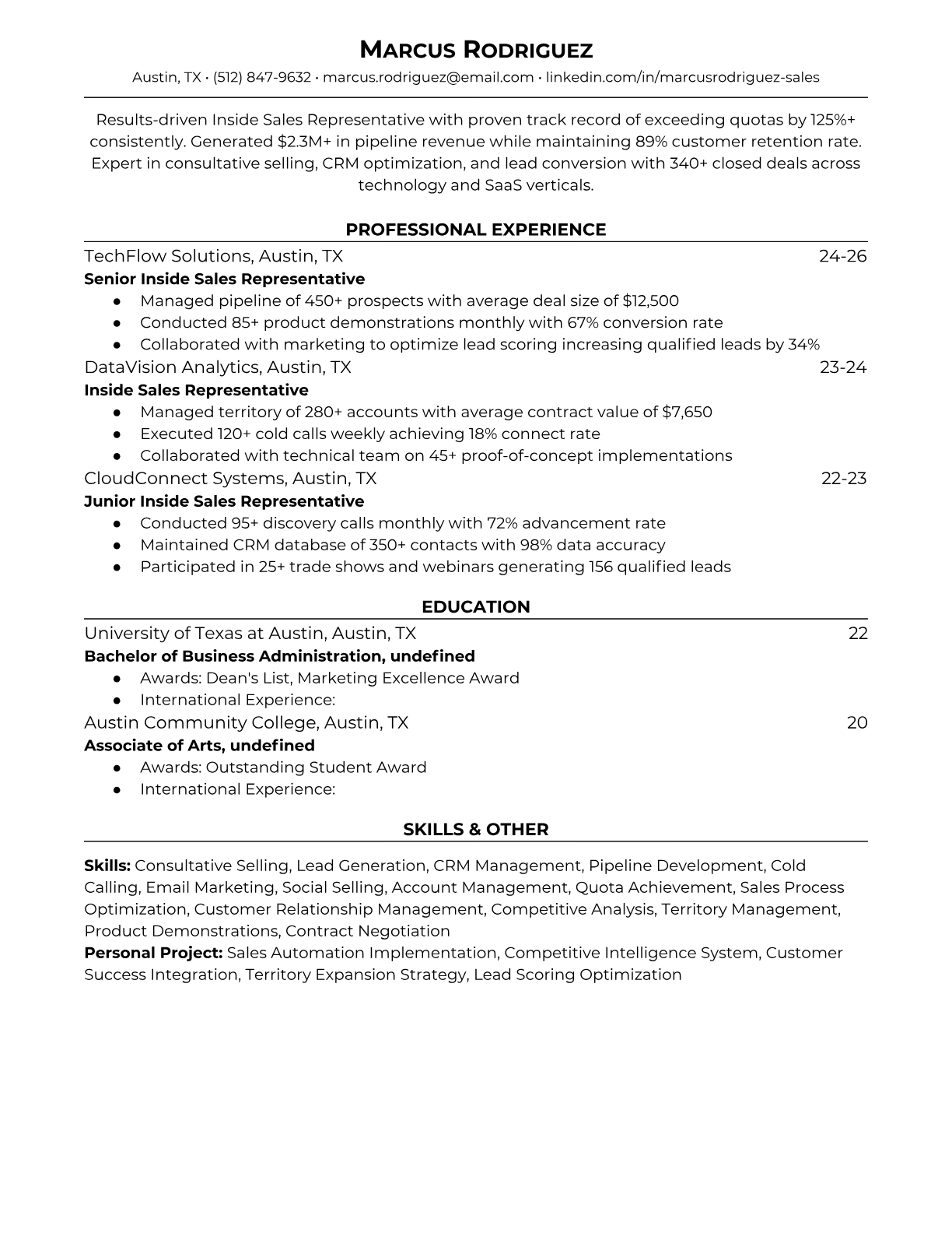 Inside Sales Representative Resume Templates - ATS-Optimized