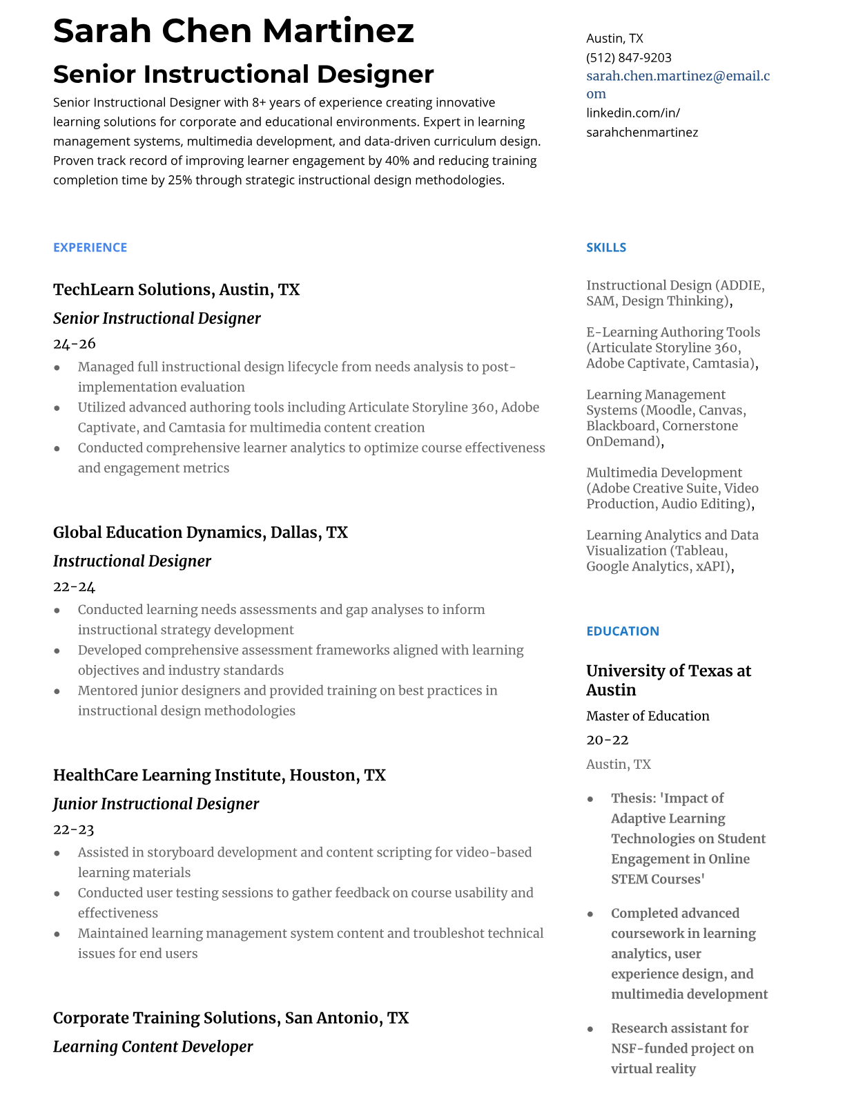 Professional resume templates for Instructional Designers. Optimized for EdTech companies and corporate learning roles. Highlights authoring tools, LMS platforms, and curriculum development expertise.